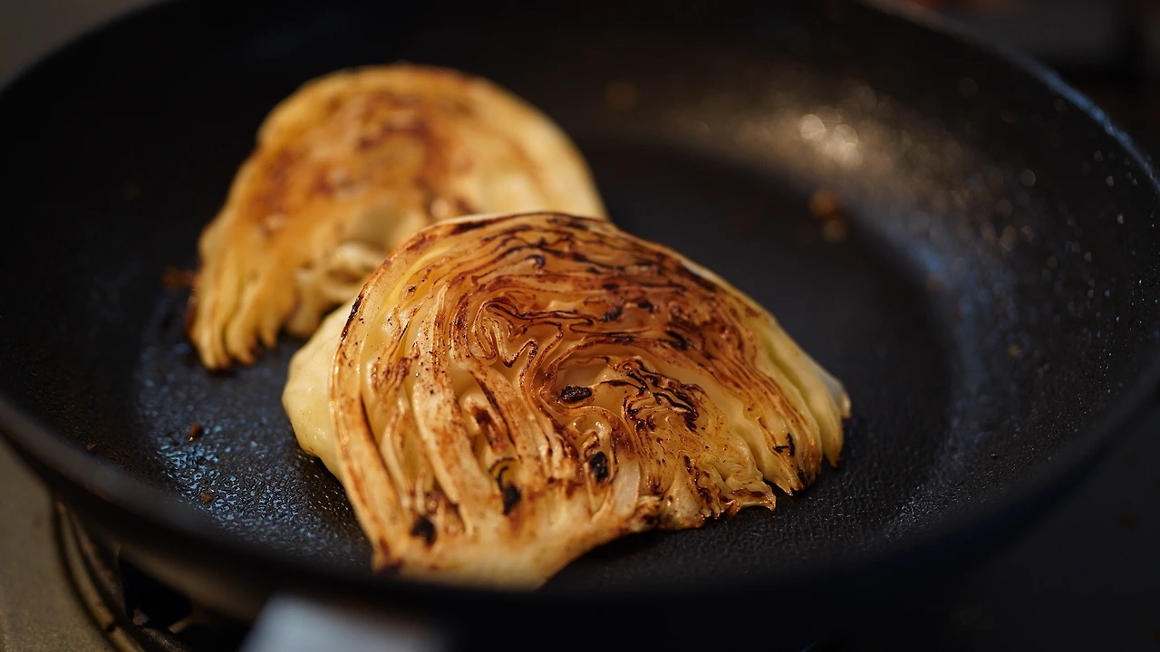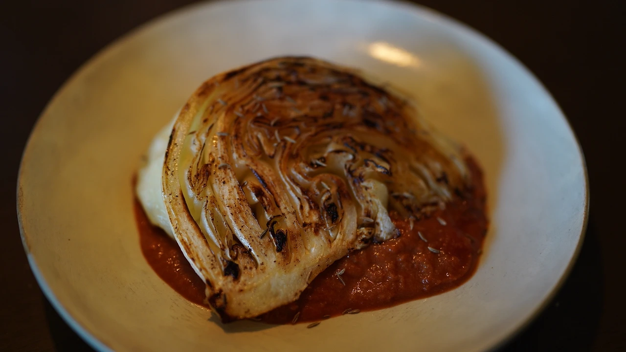 만들어둔 비건 버터를 팬에 녹이고 통으로 얇게 썬 양배추에 소금을 살짝 뿌리며 구웠다. 토마토소스는 토마토 페이스트와 두유, 볶은 채소를 넣고 만든 소스인데 라따뚜이를 만들고 남았던 거다. 양배추는 한 겹 한 겹 벗겨먹는 재미가 있었고 쯔란을 뿌려 먹으니 더 감칠맛 있었다.