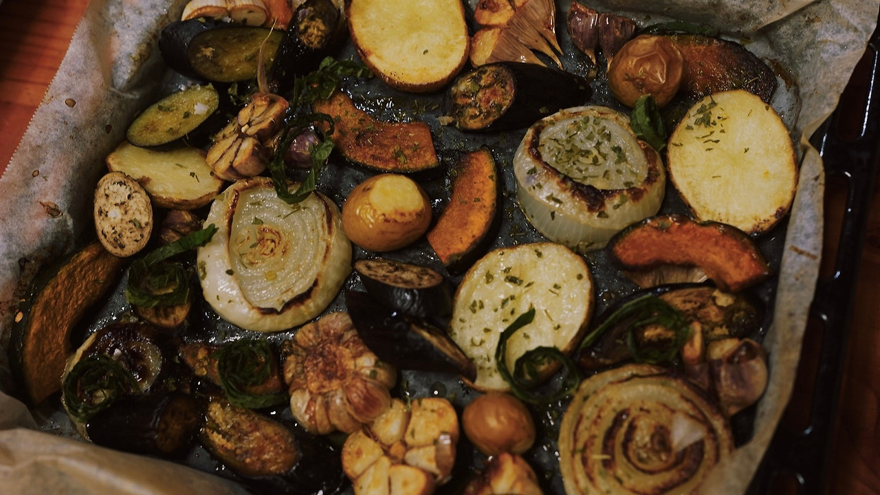 양파, 마늘, 감자, 단호박, 가지를 팬에 올려 소금을 살짝 뿌리고 올리브유를 둘러 오븐에 구웠다. 다 구운 채소 위에는 건파슬리와 동그랗게 말아 채 썬 깻잎을 올렸다. 양파는 한 겹씩 벗겨 먹고, 마늘은 한 알씩 쏙쏙 골라 먹는 재미가 있다. 채소의 단맛과 즙을 그대로 느껴보며 이야기를 나눴다.