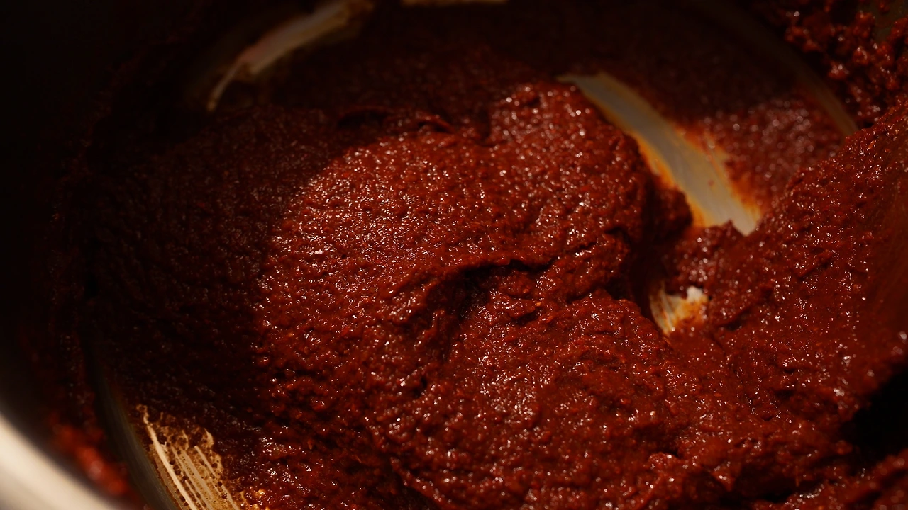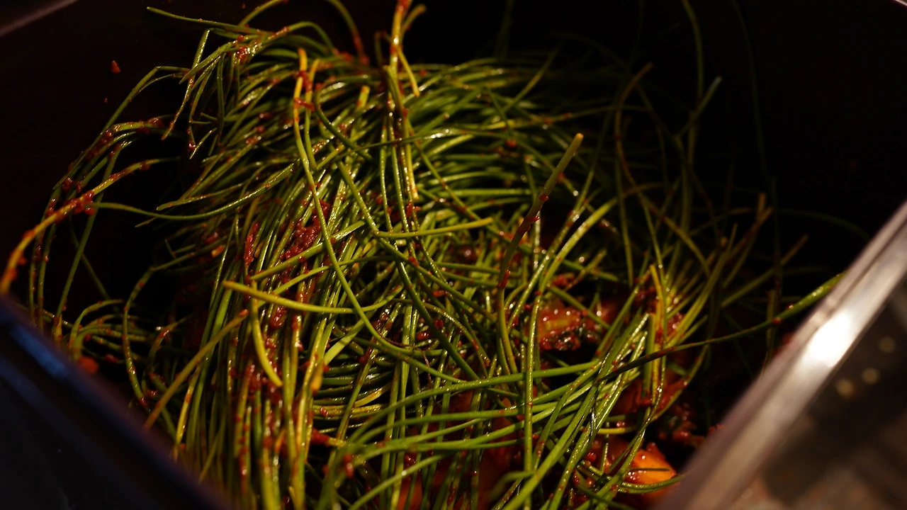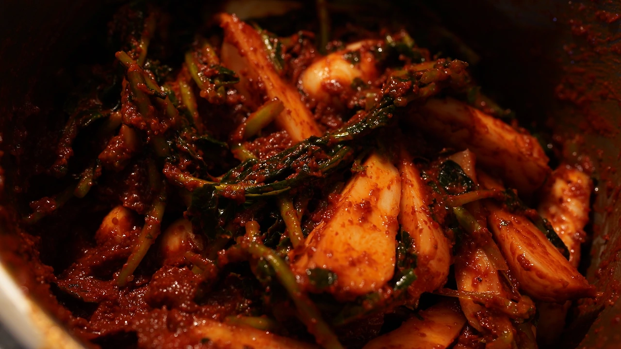 건표고버섯과 다시마, 청양고추를 넣고 채수를 끓였다. 밥을 지어 채수에 넣고 죽처럼 끓이다가 믹서에 갈아 쌀풀을 만들었다. 쌀풀이 뜨끈할 때 고춧가루를 넣고 한 김 식히고 나서 다진 마늘, 다진 생강, 생강청, 연두, 매실청, 우메수(매실을 소금에 절인 물)를 넣어 양념을 만들었다.
