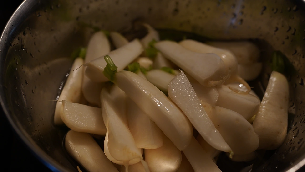 집에 와 흐르는 물에 알타리무의 뿌리 부분을 살살 문질러 흙을 씻겨냈다. 반질반질 하얗고 뽀얀 뿌리가 꼭 볼이 빵빵한 아기 얼굴 같아서 너무 귀엽다. 무청의 겉 부분은 뻣뻣해서 떼어낸다고 하는데, 버리는 게 아까워 노란 잎만 떼고 총총 썰어 소금물에 절였다.