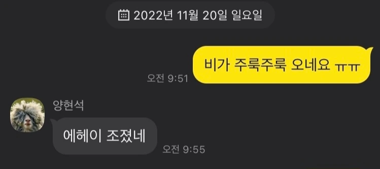 그 공연을 하는 날이 바로 오늘이었다. 오전 일곱 시쯤에 눈이 번쩍 떠졌다. 창밖으로 비 오는 소리가 투둑 투둑 들렸고, 비가 온다는 어제의 일기예보가 틀리지 않았다는 사실에 막막함이 밀려왔다. 오전 열 시가 되어갈 무렵 여유에게 양군과 소통해보라고 재촉하였고 비가 온다는 작금의 상황에 양군이 '에헤이 조졌네'라고 답을 한 것을 보고 약간의 절망감이 들었다. 날씨가 도와주지 않는구나.