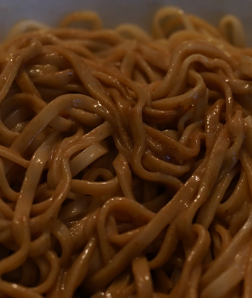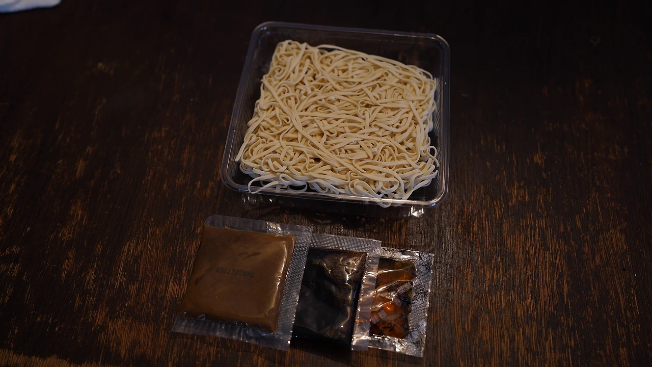 창원이 극찬하던 참깨 비빔면(태화전 마장면)을 먹었다. 보파도 메모에 가장 맛있다며 적어놓아 기대가 부풀었다. 처음 끓일 때는 소면이랑 비슷한가 싶었는데 6분 정도 끓이다 보니 가벼운 칼국수 같은 모양새가 됐다. 소스 재료로는 참깨 페이스트(마장), 맛간장, 고추기름이 있었다. 참깨 페이스트는 곱게 갈려 아무 간이 되어 있지 않았고 맛간장은 달았다. 고추기름에는 마라 향이 나는데 그냥 마라소스인가 싶기도 하다. 면이 다 끓으면 소스와 같이 비벼먹으면 된다.