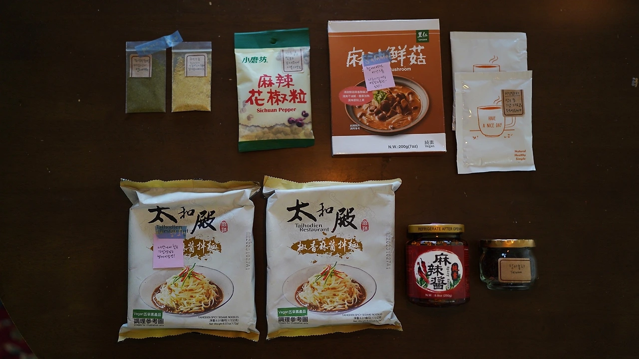 어제 보파의 대만 여행 꾸러미를 받았다. 택배 박스를 열자마자 노랗고 빨간 부적이 눈에 띄어 확 낯선 느낌을 받았다. 박스 안에는 빨간 산초, 소분한 큐민소금과 녹색 산초가루, 마라장, 장미홍차, 참깨 버섯 비건스튜, 참깨 비빔면(태화전 마장면), 비건 밀크티가 있었다. 재료와 제품에 귀엽게 메모가 붙여져 있어 알기 쉬웠다. 마라장은 뚜껑을 열지도 않았는데 향이 강렬했다. 2월 비건 요리에 활용해 봐야지.