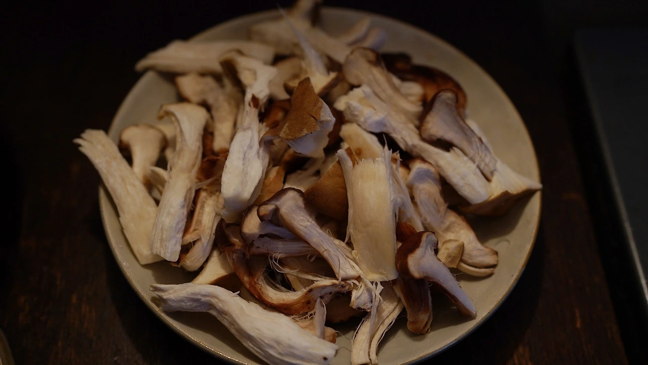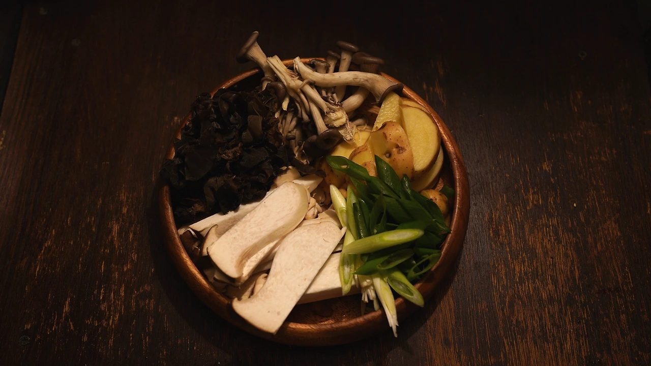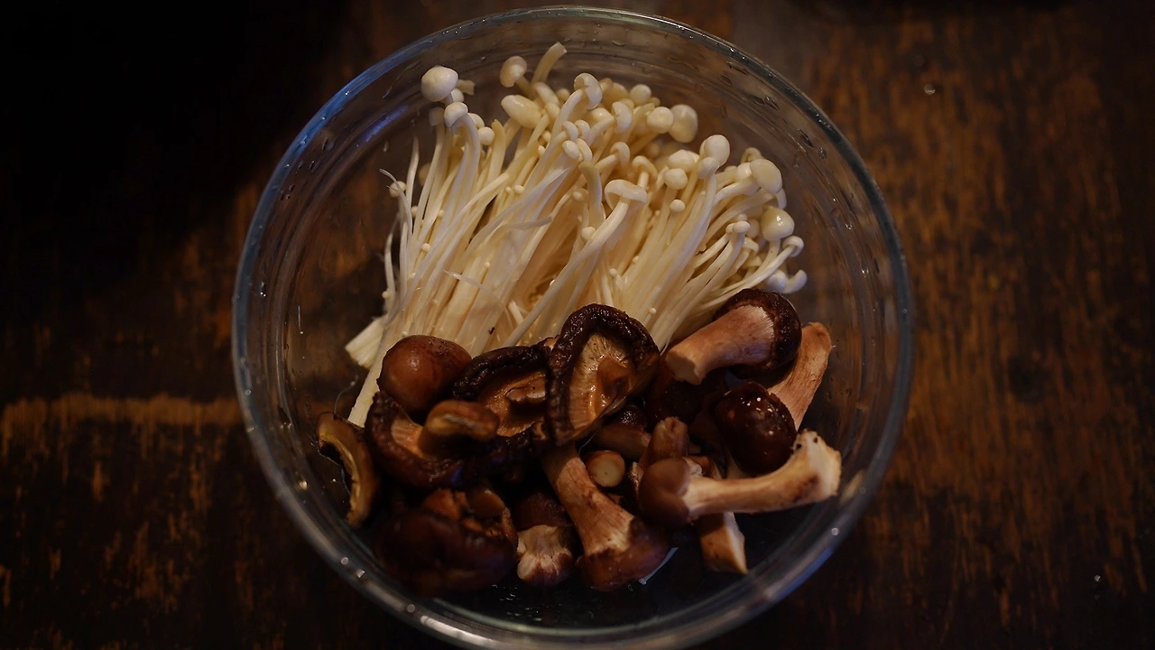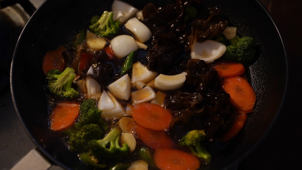 버섯을 종류별로 손질했다. 탕수 소스는 간장, 식초, 아가베시럽, 레몬즙으로 맛을 내고 전분가루를 넣어 농도를 맞췄다. 소스를 팬에서 끓이다가 목이버섯, 당근, 양파, 브로콜리, 마늘, 땡초를 넣어 익혔다. 기름진 음식인데 소스가 새콤해서 크게 부대낌이 없다.