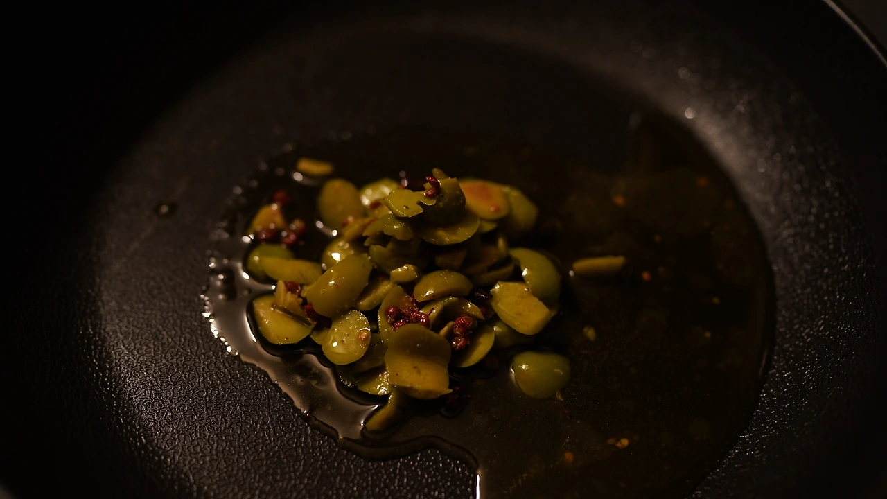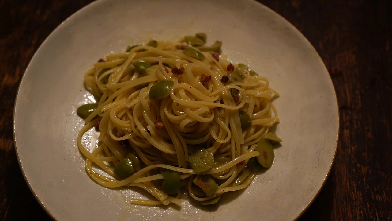 올리브오일, 그린올리브, 산초, 연두로 소스를 만들어 반나절 정도 재워뒀다. 파스타 면을 소금물에 삶고, 팬에 소스와 면을 버무려 볶는다. 그린올리브와 산초에 간이 배어 감칠맛이 난다.