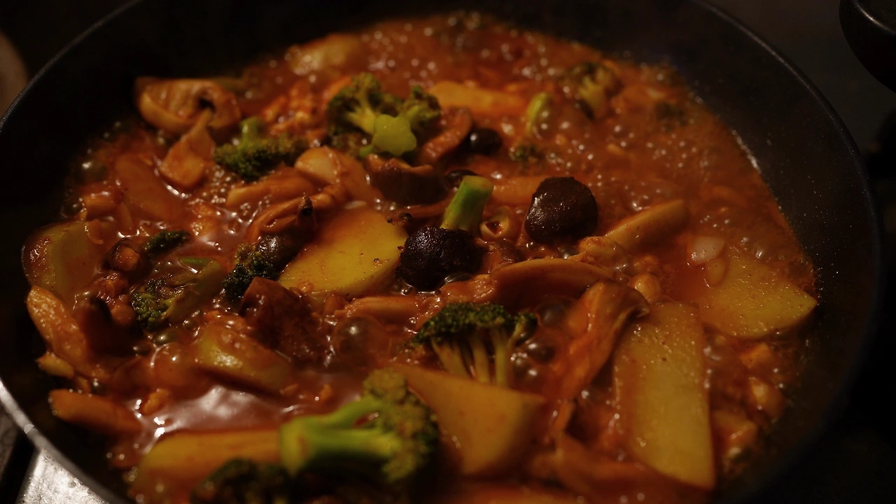 버섯을 결대로 찢고, 감자, 브로콜리를 먹기 좋은 크기로 썰었다. 팬에 기름을 두르고 준비한 재료를 넣어 버섯의 수분이 날아갈 때까지 볶는다. 소스는 고추장, 매실청, 다진 마늘, 후추, 캐슈넛을 섞어 만들었다. 팬에 소스와 물을 넣어 재료에 스며들도록 강불에 조린다. 익숙한 맛인데 고수를 올리니 낯설어졌다.
