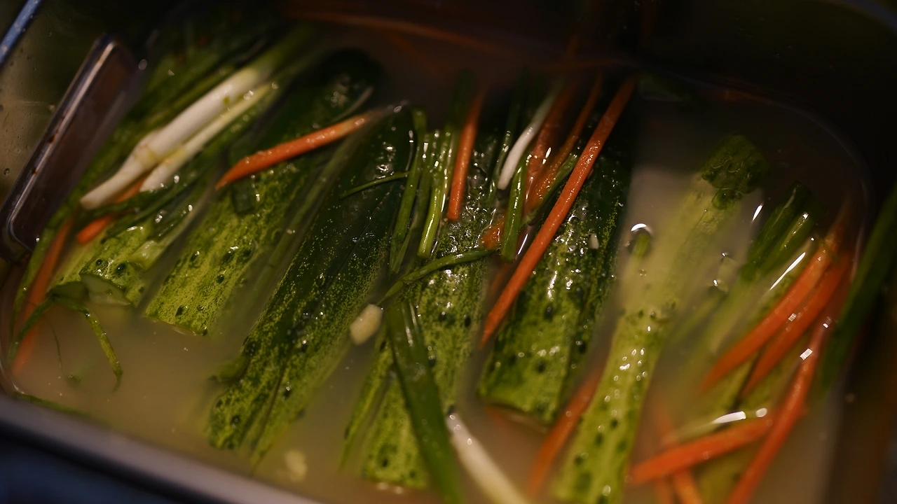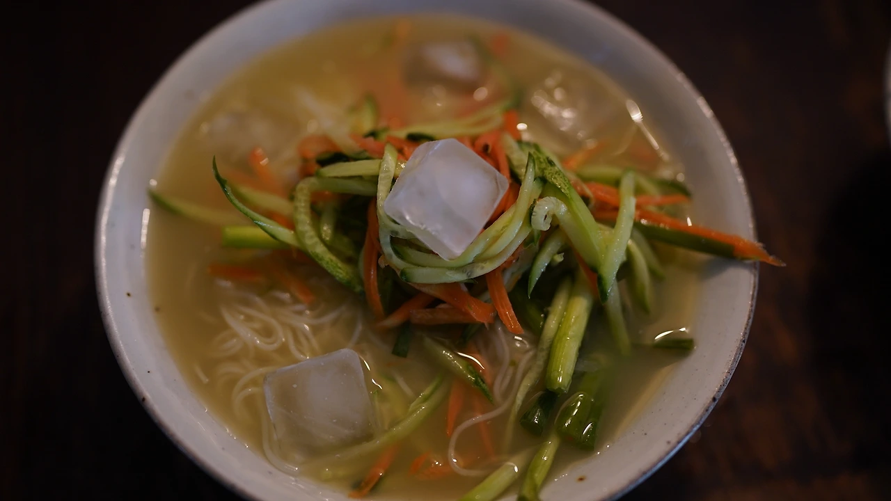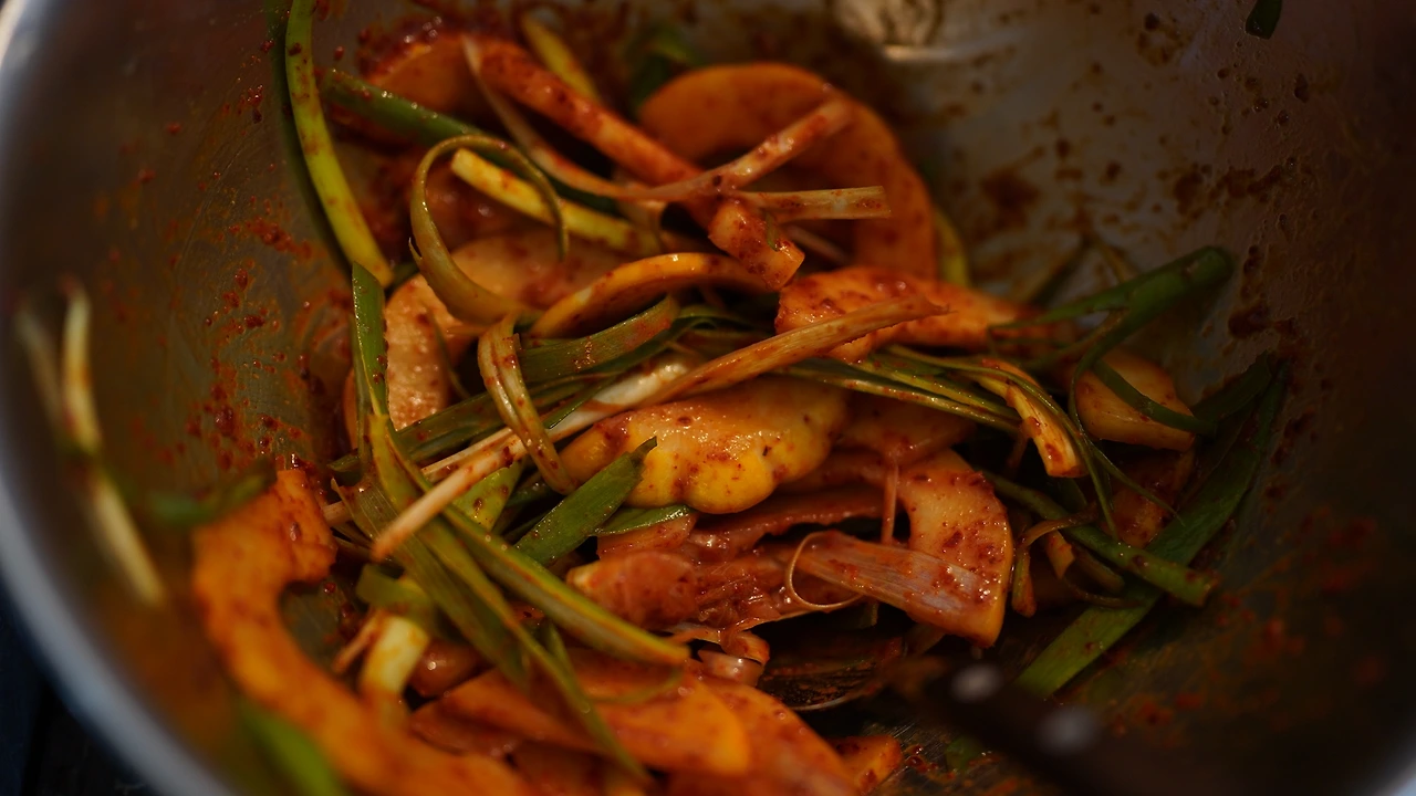 오이를 이등분하고 십자로 칼집을 내서 소금물에 재운다. 뜨거운 물에 현미가루를 넣어 쌀풀을 만든다. 쌀풀에 물, 배, 마늘, 생강, 소금, 연두, 매실청, 청양고추, 홍고추를 넣고 믹서로 간다. 오이와 채 썬 당근, 길게 썬 쪽파에 양념을 붓고 냉장고에 이틀 재운다. 물김치는 평상시에 반찬으로 야무지게 먹고 동이 날 때 즈음 소면을 삶아 국수를 만들어 먹었다.
