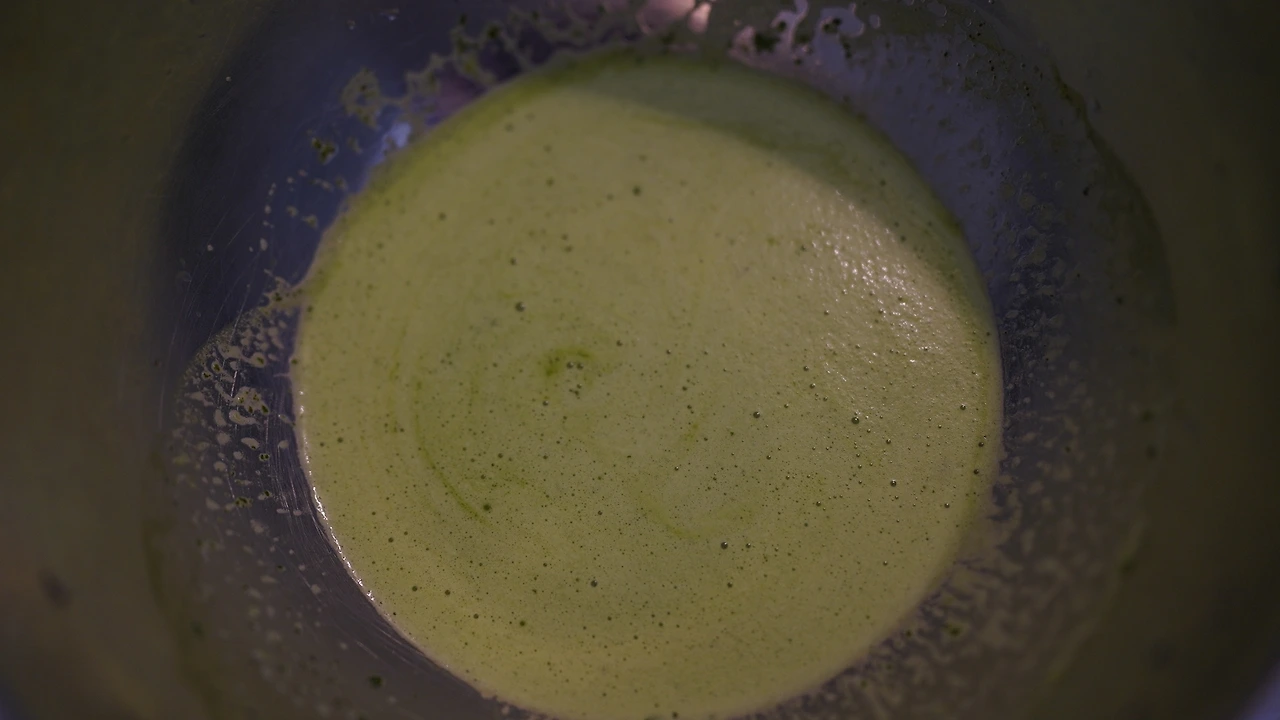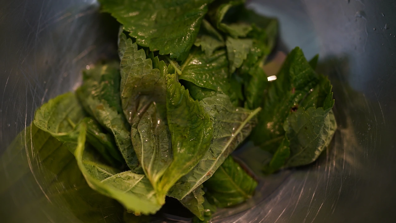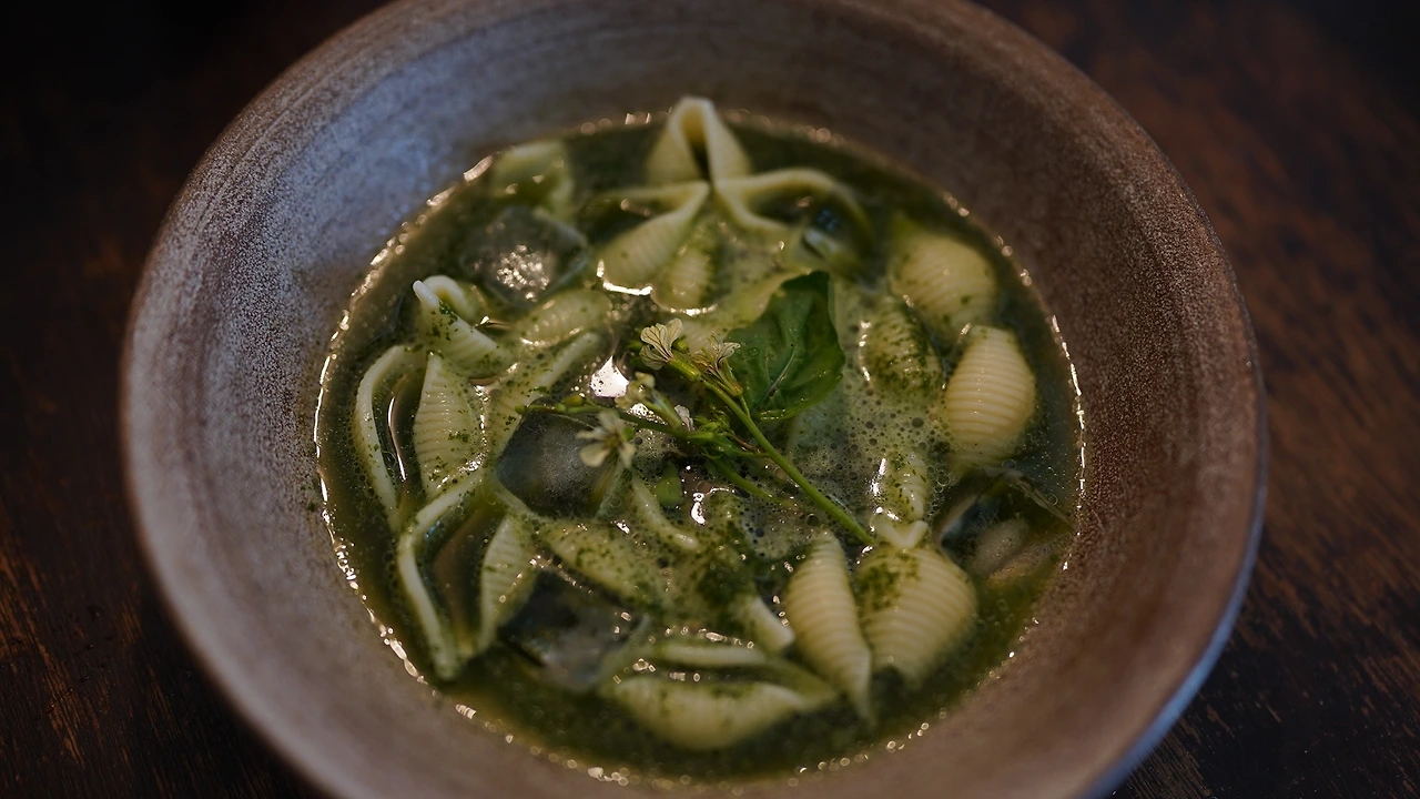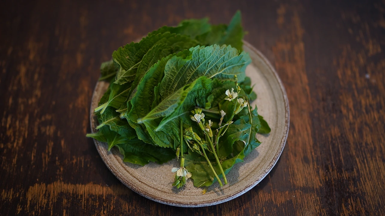 깻잎, 레몬즙, 매실청, 고추냉이, 간장, 물을 조합해서 소스를 만든다. 얼음을 넣으면 희석되니 간을 세게 한다. 파스타면(콘킬리에)을 평소 삶는 것보다 더 삶고 찬물에 헹궜다. 소스에 얼음을 넣고 면을 넣어 버무린 후 루꼴라 꽃을 올렸다. 고추냉이를 넣어서 시원하고 톡 쏘는 맛이 난다.