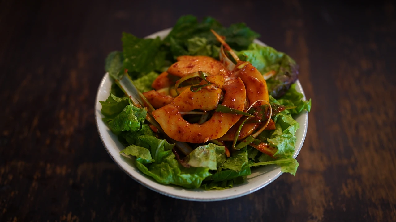 참외는 씨를 제거하고 채 썬다. 대파도 길게 썰어둔다. 참외, 대파에 매실청, 고추장, 고춧가루, 참기름, 다진 마늘, 간장을 넣어 버무린다. 그릇에 밥과 쌈채소를 쌓고 위에 참외무침을 올린다. 참외의 달콤함과 대파의 알싸함이 잘 어울린다.