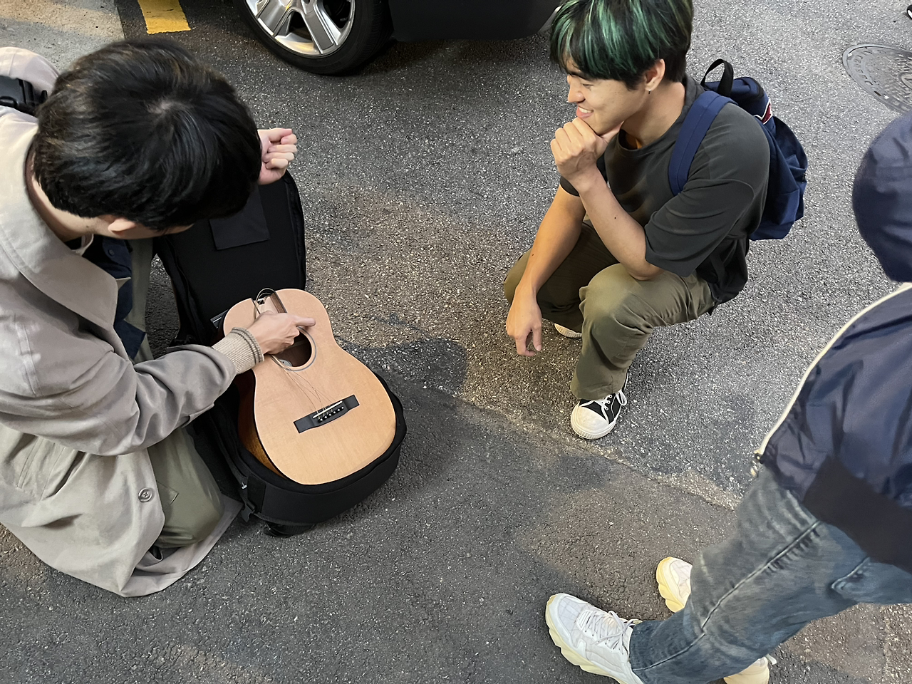 넷이 뭐 먹을까 하다가 대봉이 미슐랭 우동 맛집을 소개해서 갔다. 한 시간은 기다리며 얘기했는데 각자 타이틀곡을 어떤 곡으로 생각하는지도 나눴다. 난 2번. 난 6번. 난 타이틀은 하나였으면 좋겠어. LP로도 내게 되면 앞판에 하나 뒤판에 하나 있어야 되니까 앞판에 2번 뒤판에 6번 어때. 오~ 똑똑한데. 여유는 등에 멘 조립식 기타도 자랑했다. 조립식 기타는 수납이 간편해서 비행기를 탈 때 무척 용이하다.