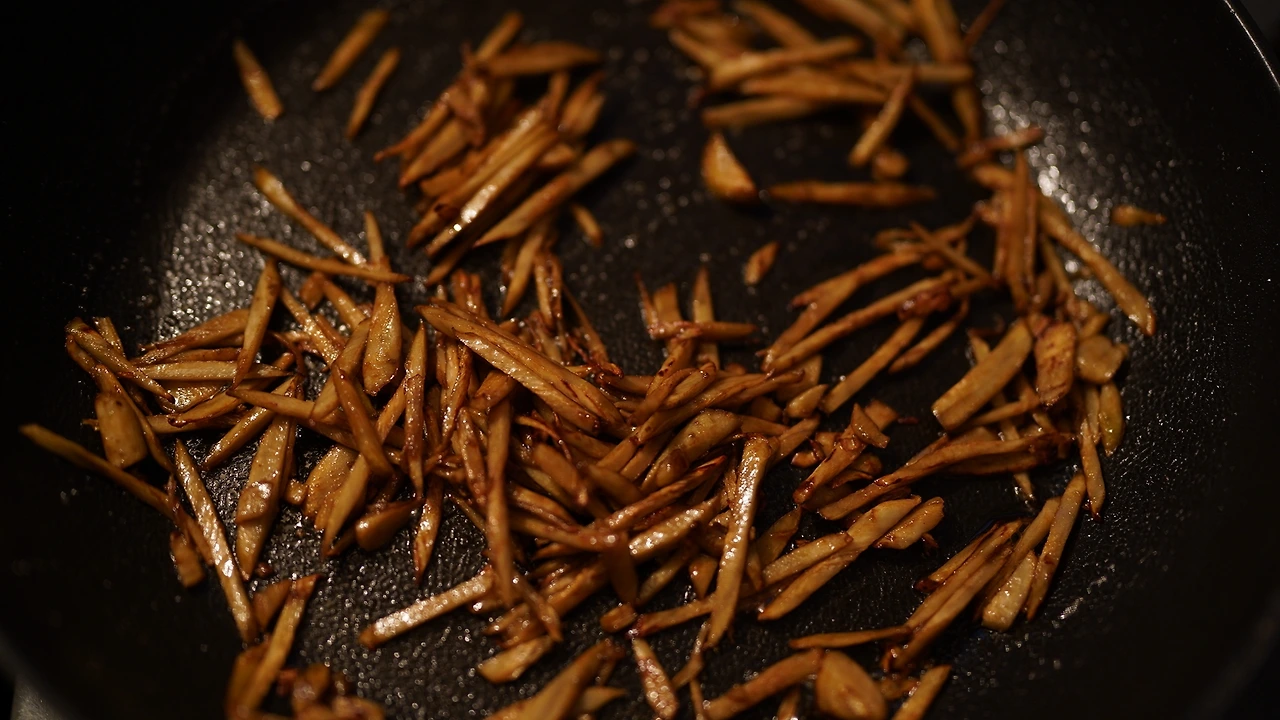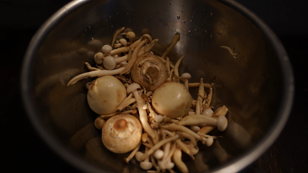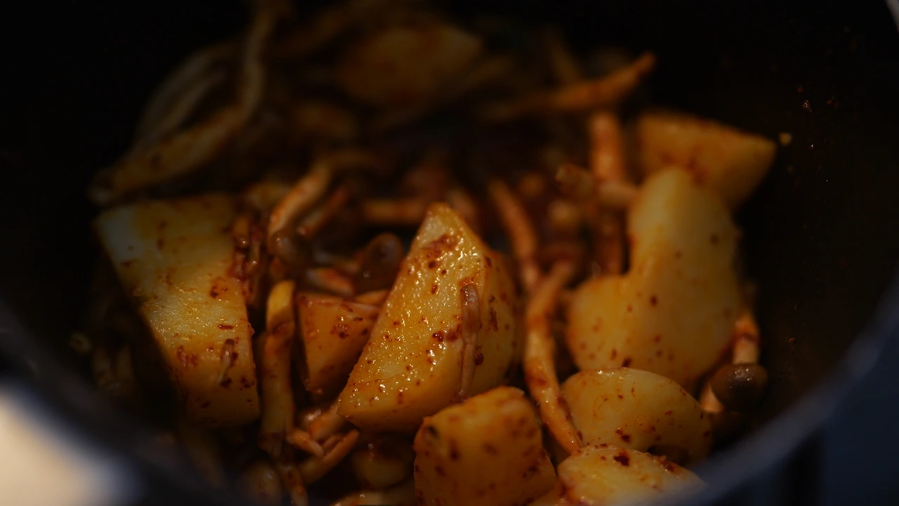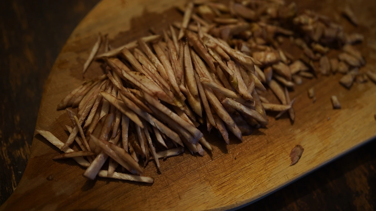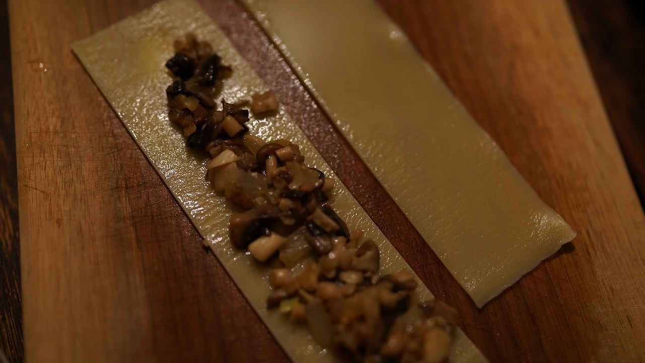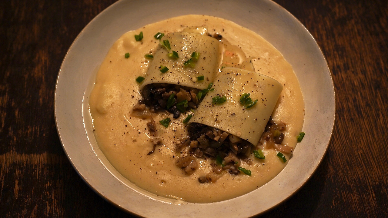 삶은 감자, 비건 치즈, 두유를 갈아 감자 크림을 만들었다. 비건 치즈가 짭짤해서 따로 간을 하지는 않았다. 감자에 전분이 있어 두유의 양을 조절하면 꾸덕하게 먹을 수 있다. 버섯류와 양파를 잘게 썰고 센 불에 달달 볶다가 물기가 날아가면 불을 끄고 트러플오일을 섞는다. 소금물에 끓인 라자냐를 반으로 자르고 그 위에 볶은 재료들을 올려 돌돌 만다. 감자 크림 위에 롤을 얹고 땡초를 뿌린다.