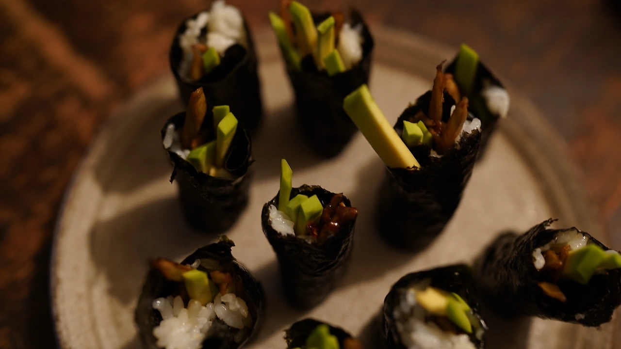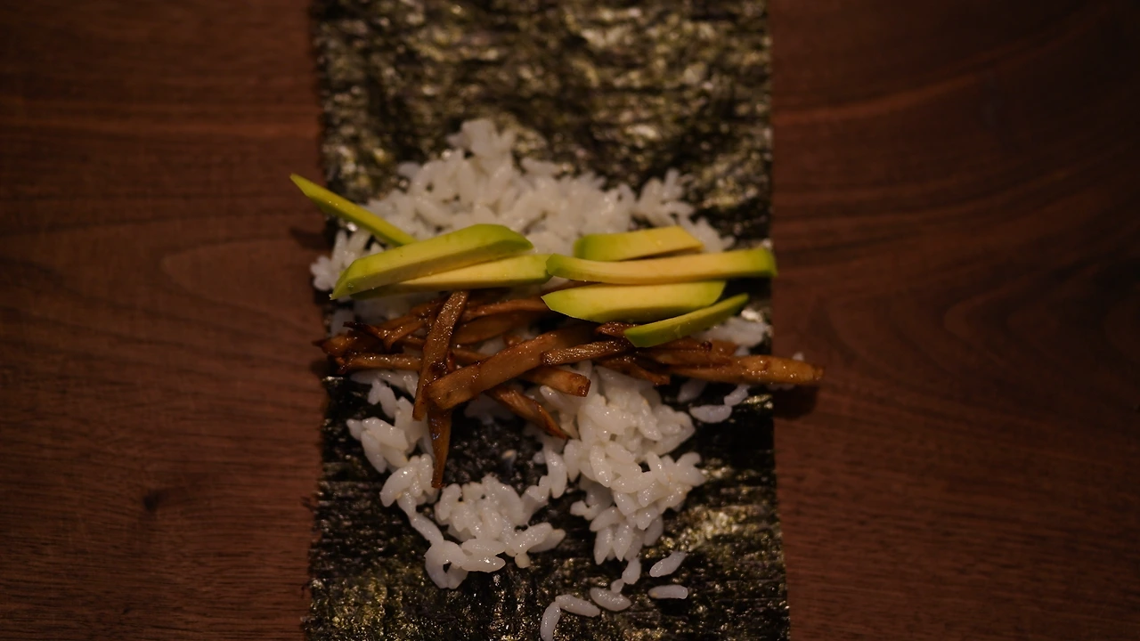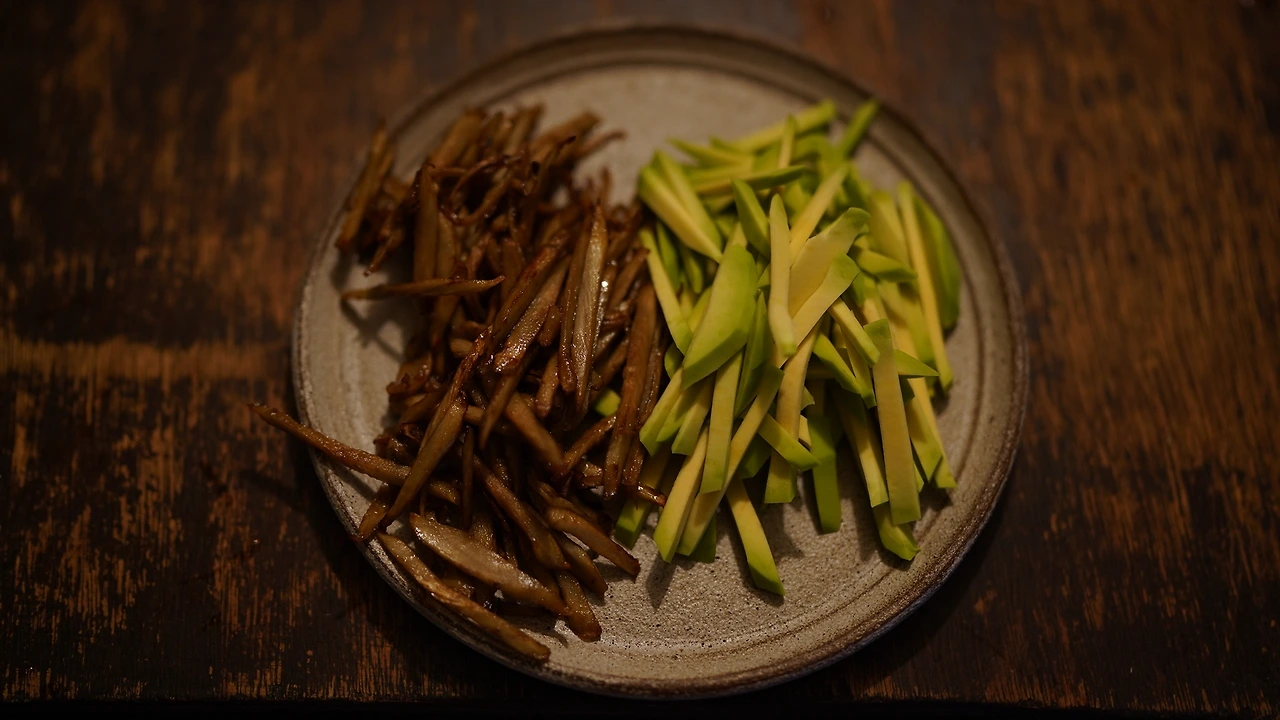 우엉을 길게 썰고 참기름에 볶다가 간장, 생강청을 넣어 조린다. 아보카도도 길게 썬다. 사등분한 김밥김에 밥을 약간 얹고 우엉조림과 아보카도를 넣어 돌돌 만다. 별다른 재료가 들어간 것도 아닌데 네 가지 재료가 퍼즐처럼 딱 들어맞는다.