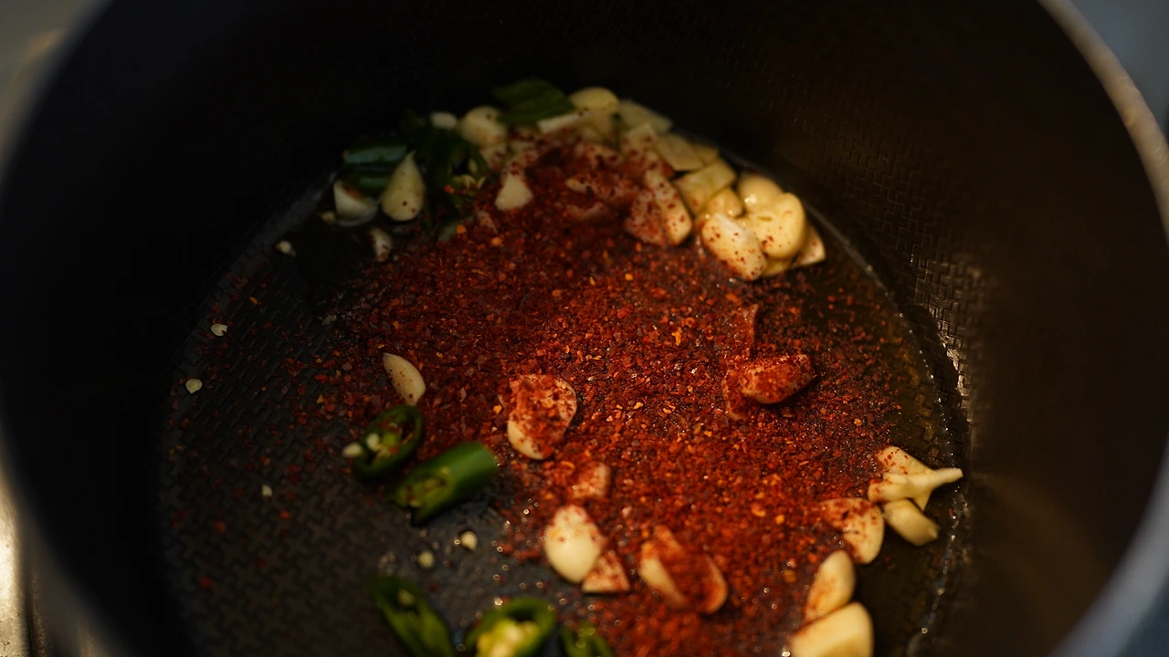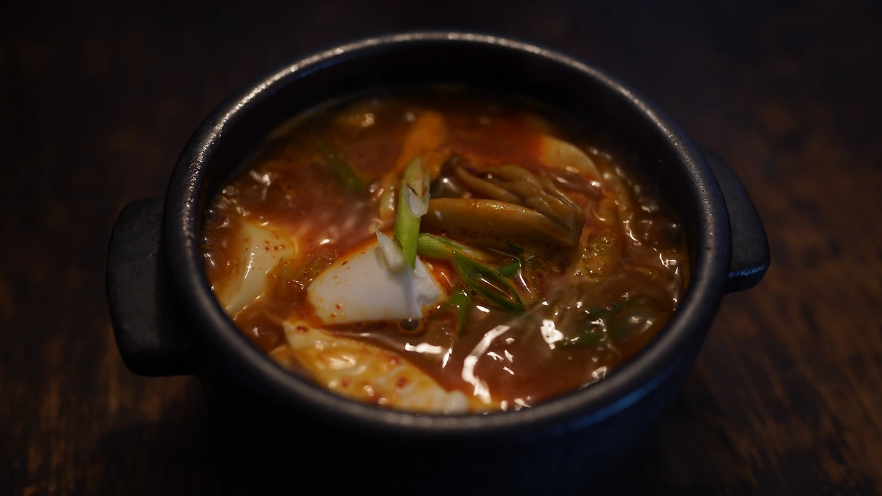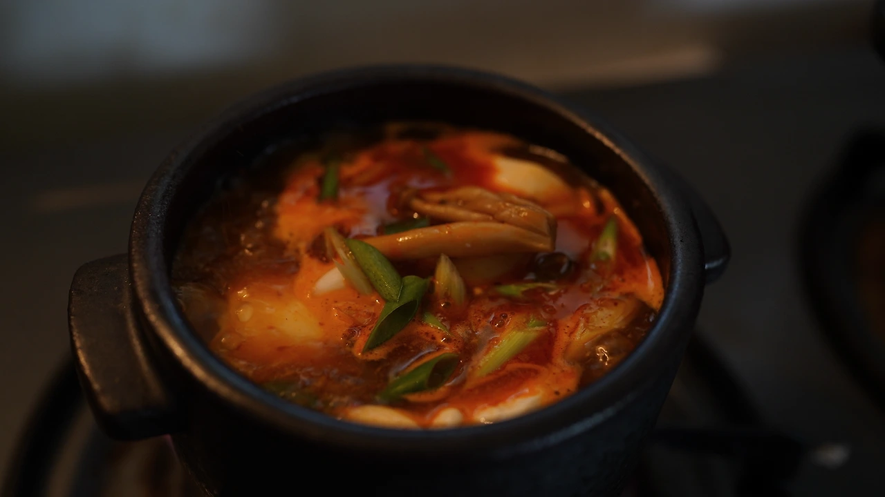순두부찌개는 소주병에 담긴 참기름이면 게임 끝이다. 나의 친할머니는 성정이 유하고 고운 분이었는데, 깨농사를 지어 참기름을 만들 때는 혹여나 방앗간에서 빼돌릴까봐 지팡이를 들고 감시할 만큼 민감했다고 한다. 지금 내가 갖고 있는 참기름은 할머니가 돌아가신 후에 삼촌이 깨농사를 지어 만든 것이다. 이런 참기름이야 말로 한국인의 얼이 담긴 소울푸드다. 참기름에 마늘, 고춧가루, 땡초를 볶는다. 마늘 향이 올라오고 고춧가루가 타지 않을 만큼 볶으면 다른 재료를 부어 섞다가 간한 채수를 넣어 끓인다. 순두부는 마지막에 살짝 거드는 느낌으로 가볍게 넣는다. 먹는 동안의 열 보존을 위해 뚝배기에 옮겨 끓였다.