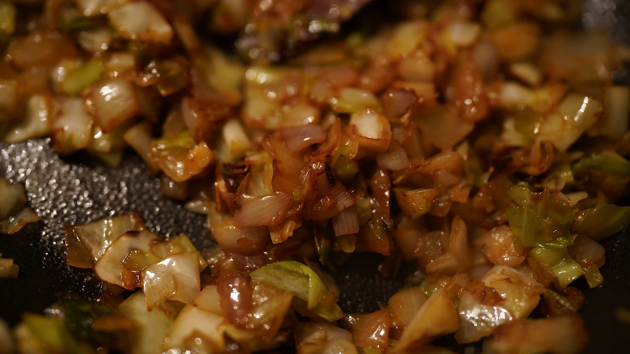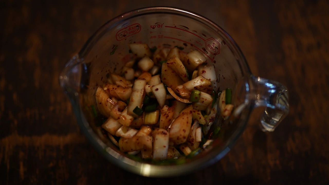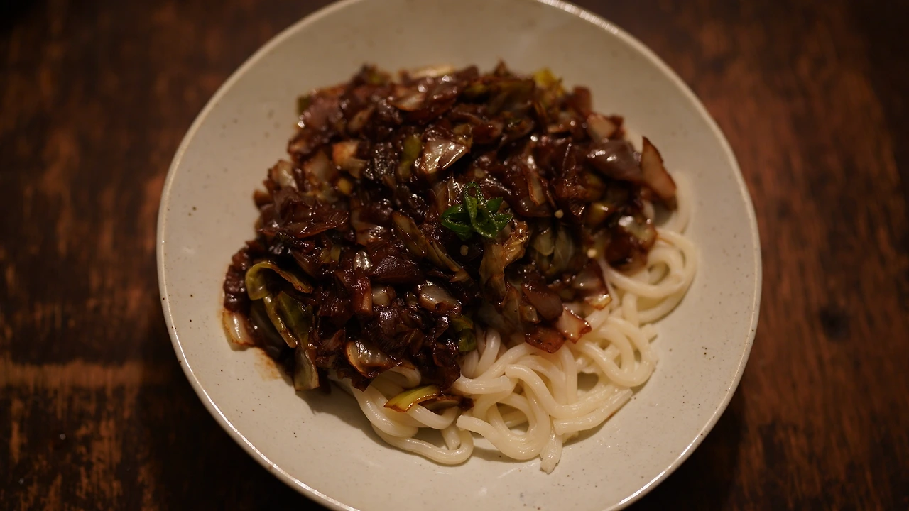 파, 양배추, 양파를 잘게 썬다. 팬에 기름을 두르고 달궈지면 파를 넣어 볶는다. 파가 노릇해지면 양배추와 양파를 넣어 숨이 죽을 때까지 볶는다. 채소의 수분기가 거의 다 날아갔을 때 팬 가장자리에 간장과 초생강, 당류를 넣고 팬을 기울여 강불에 태운다. 춘장과 약간의 채수도 넣고 볶는다. 마지막엔 불맛을 내려고 토치로 지졌다. 데친 우동면에 소스를 부어 먹는다. 익숙한 맛을 구현하기 위해서는 생각보다 기름과 당류가 많이 들어간다. 비건다시다를 넣는다면 시중에 파는 맛과 좀 더 가까워질지도 모르겠다.