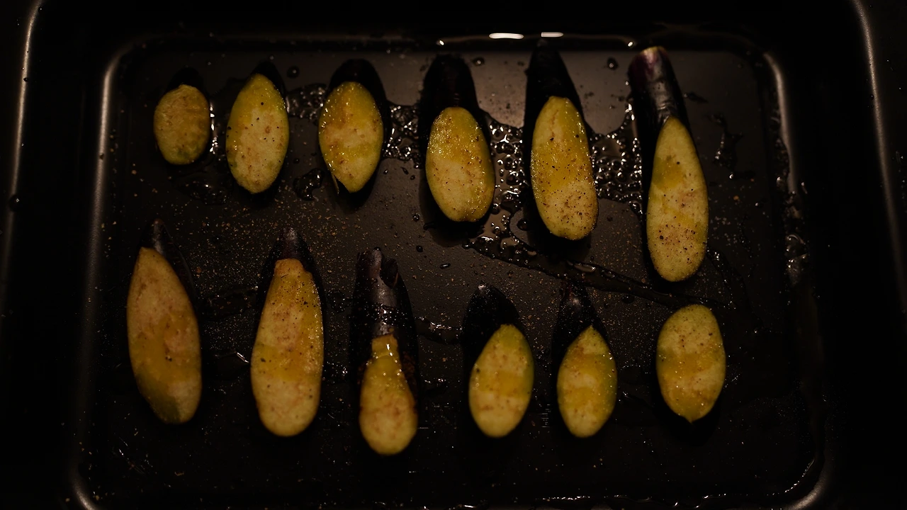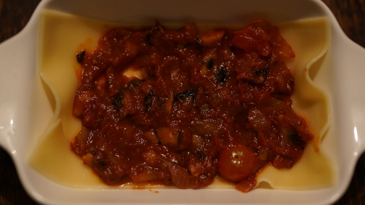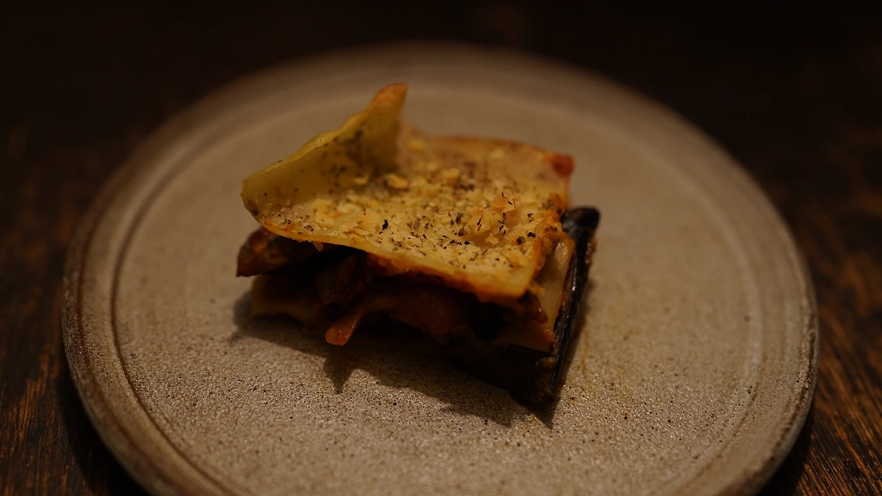 가지는 뚱뚱하게 썰어 오븐팬에 올리고 올리브유와 소금을 뿌려 오븐에 굽는다. 양파와 마늘을 잘게 썰고 팬에 기름을 둘러 노릇해질 때까지 굽는다. 잘게 썬 양송이버섯과 손으로 짓이긴 방울토마토는 나중에 넣었다. 재료들이 적당히 익으면 토마토소스를 넣고 마저 볶는다. 다른 팬에 비건 버터와 현미가루를 볶다가 무가당두유를 넣어 화이트소스를 만든다. 라자냐 면은 소금물에 끓인다. 오븐 용기에 라자냐 면, 토마토소스, 가지, 화이트소스, 비건 치즈 순으로 층층이 쌓아준다. 오븐에 바짝 굽는다.