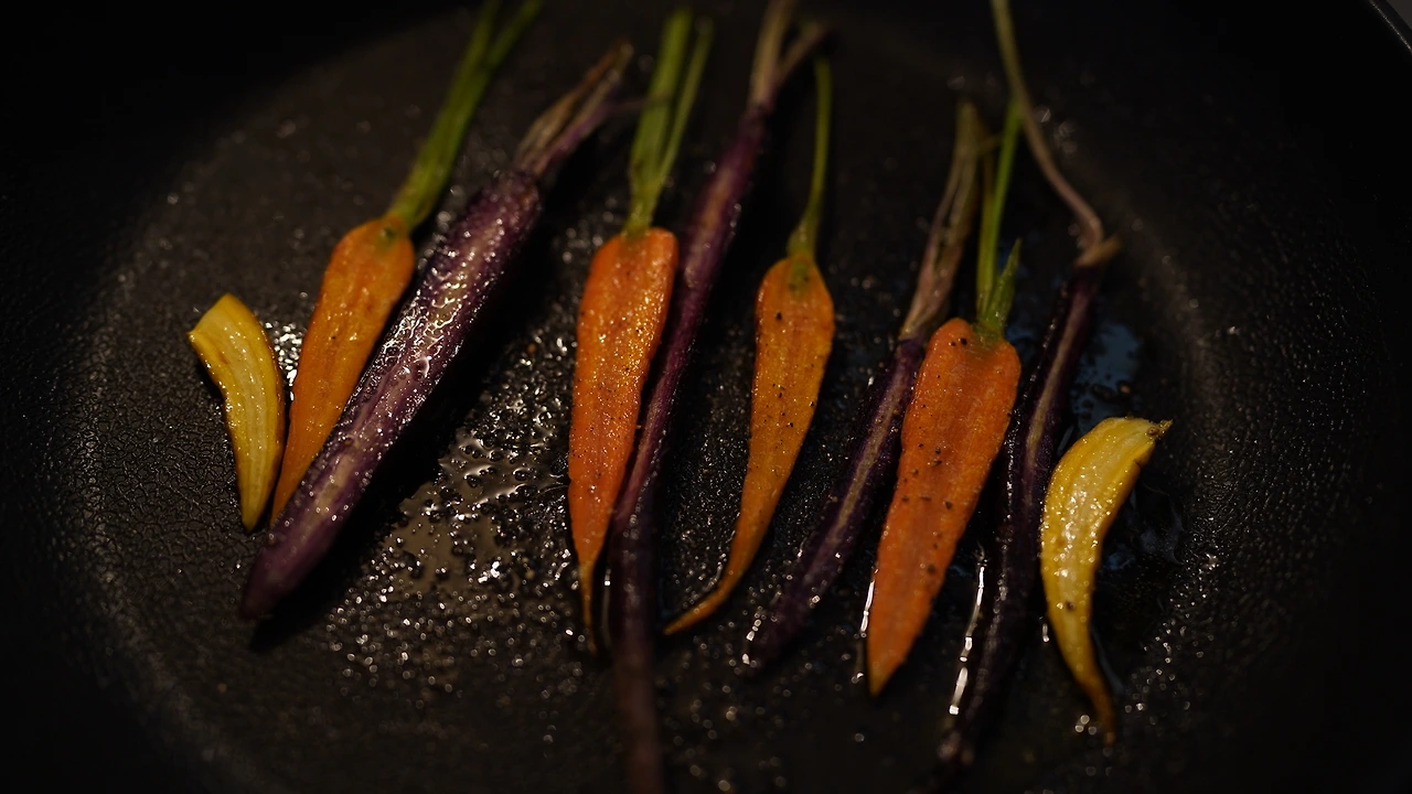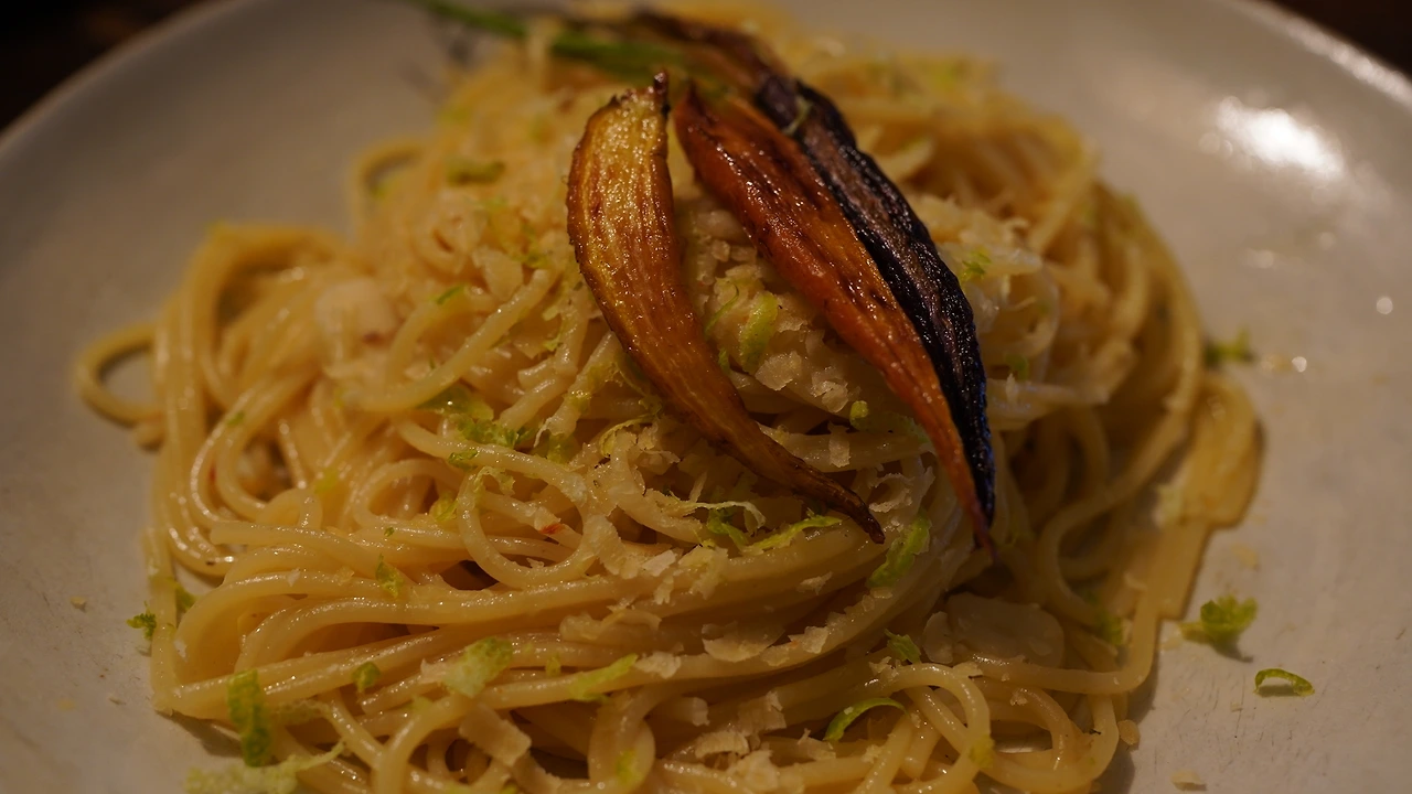 얼마 전에 신정원 셰프가 하는 '제주밭한끼'에 참여하고 제주 제철 식재료들을 받아왔다. 장바구니가 꽉 찰 정도로 이것저것 많이 받았는데 그중 삼색 당근과 레몬으로 파스타를 만들어 보았다. 당근은 반으로 썰고 올리브오일에 바짝 구워 따로 놔둔다. 팬에 비건 버터, 편마늘을 넣어 볶고 마늘이 익으면 레몬즙, 연두, 당류를 넣어 소스를 만든다. 소금물에 끓인 파스타면을 팬에 옮겨 담고 소스가 충분히 배이게 한다. 그릇에 옮겨 담고 비건 치즈와 레몬껍질을 갈아 올리고 삼색당근으로 마무리한다.