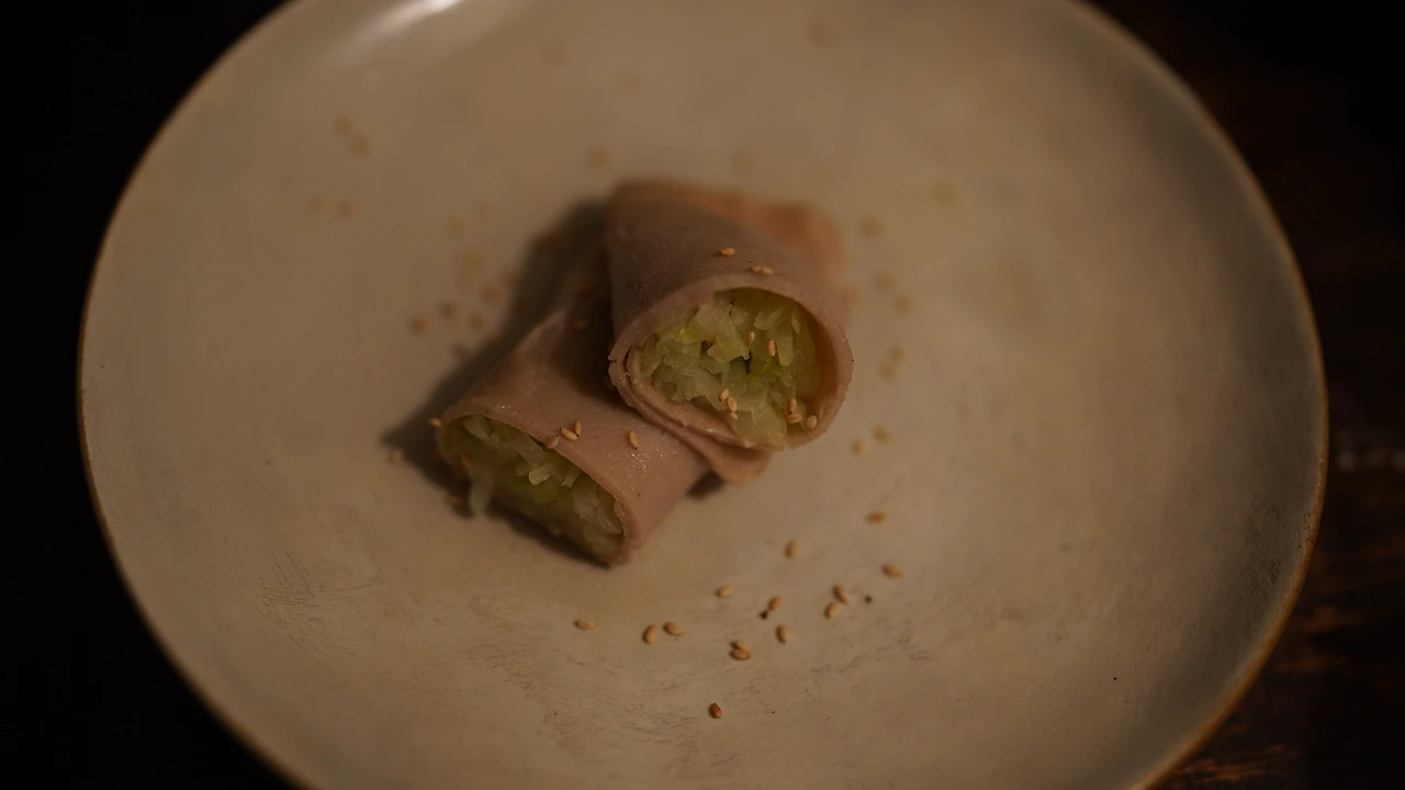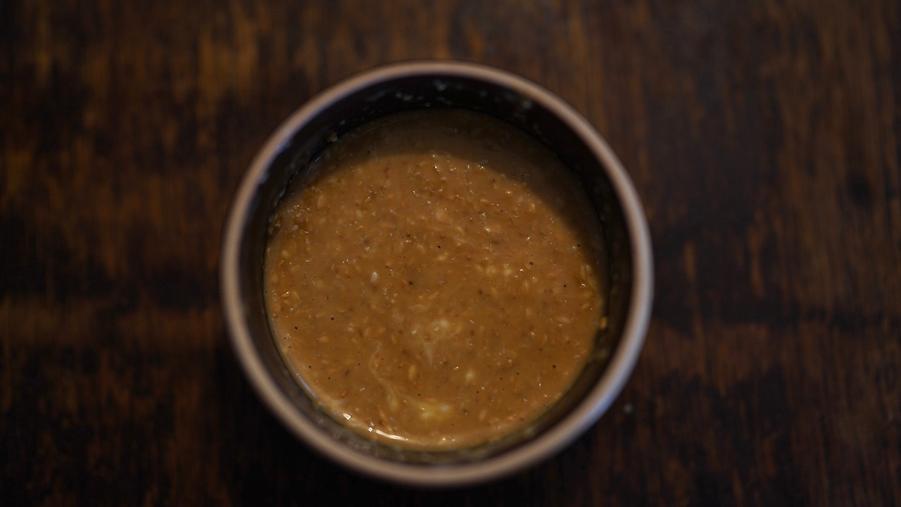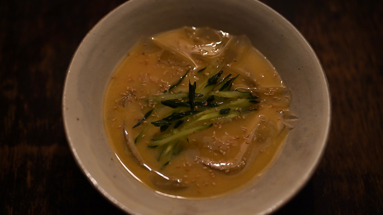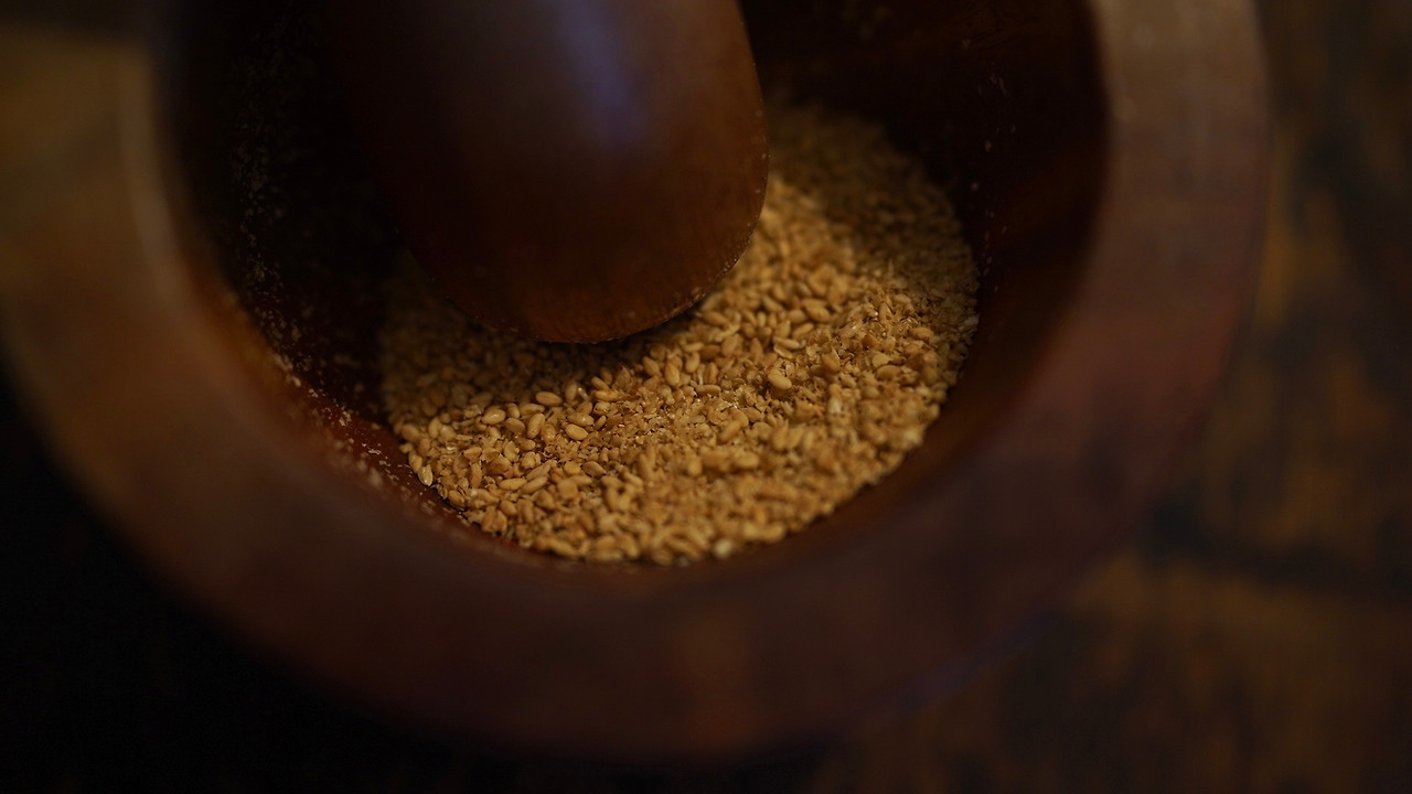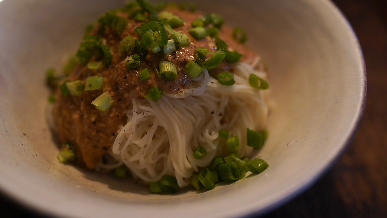절구에 참깨를 넣고 곱게 간다. 참깨, 간장, 매실청, 소이마요, 레몬즙을 섞어 소스를 만든다. 소면을 삶고 찬물에 헹군 후 그릇에 담는다. 위에 소스를 붓고 쪽파와 땡초를 썰어 올린다. 후추도 솔솔 뿌려준다.