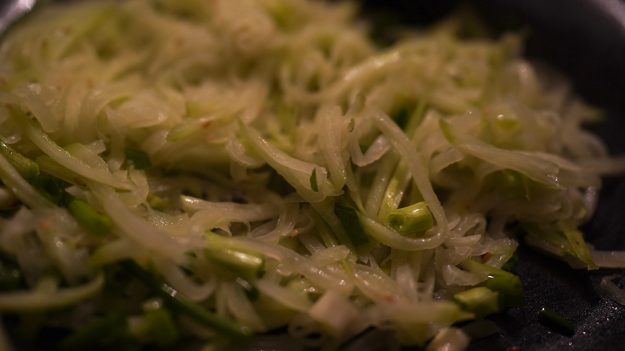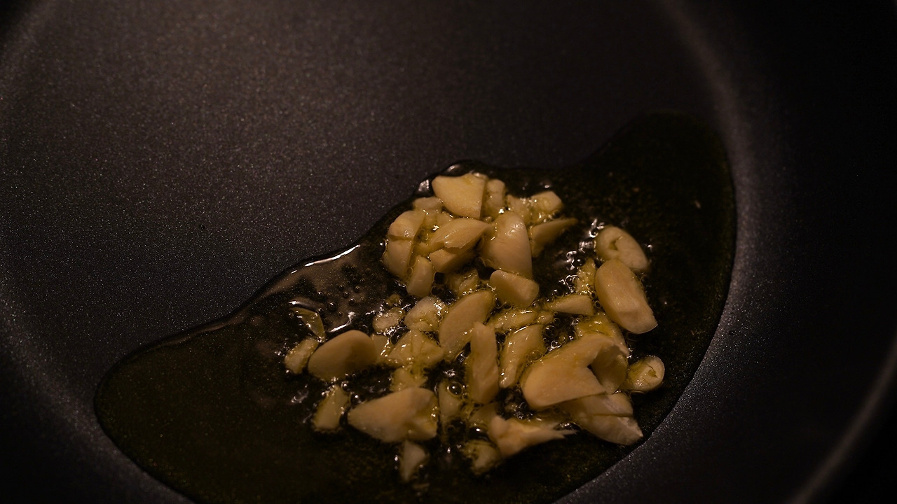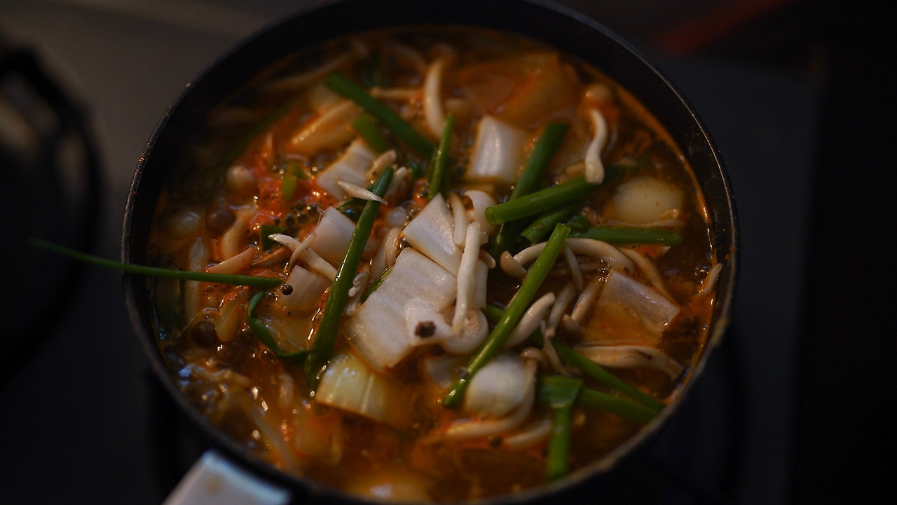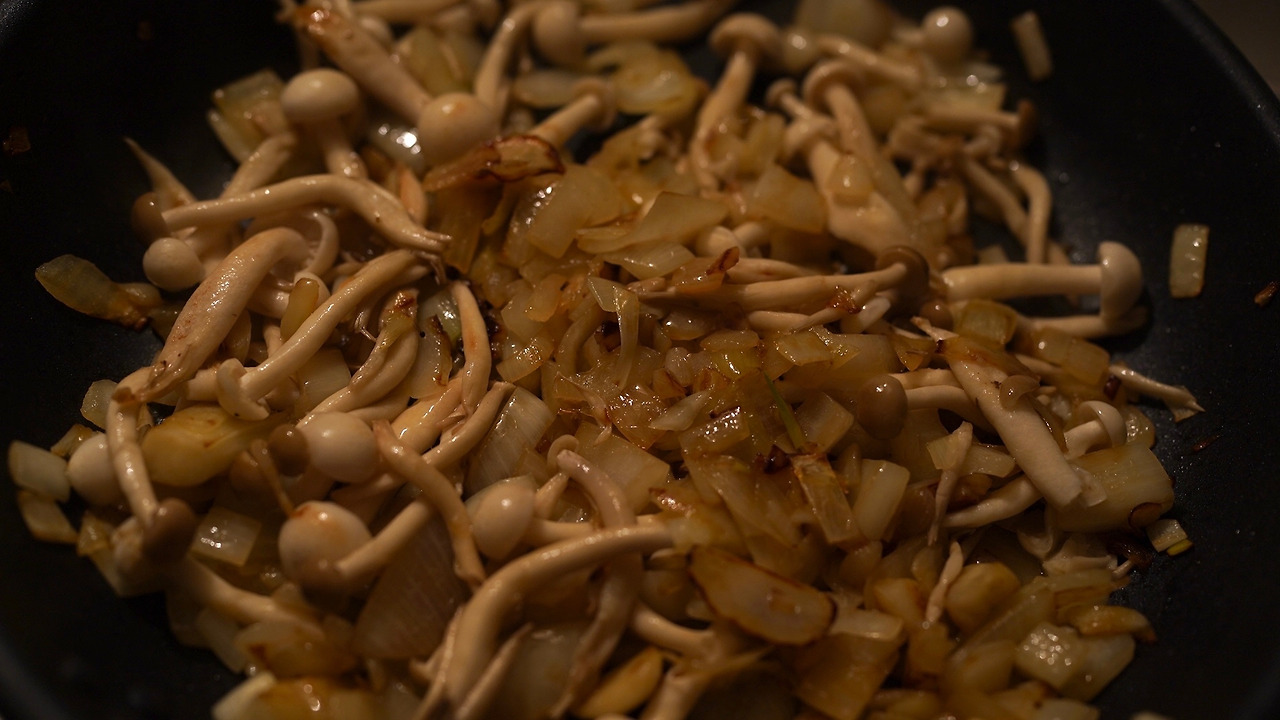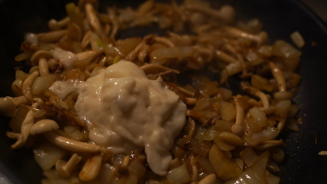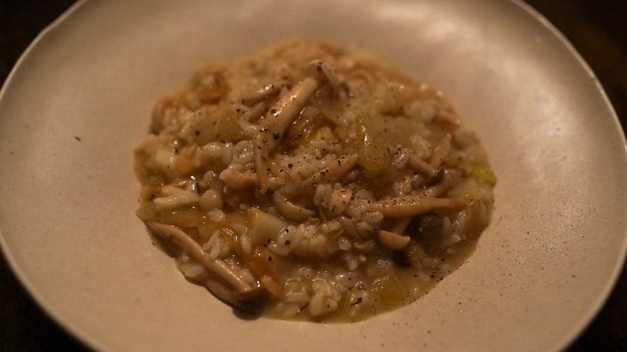 찬밥을 활용한 요리. 팬에 기름을 두르고 마늘을 볶는다. 양파를 넣고 재료가 노릇하게 익으면 버섯도 함께 볶는다. 비건 화이트소스, 물, 연두를 더해 뭉근하게 끓인다. 찬밥을 더해 익히다가 밥알이 부드러워지면 불을 끄고 그릇에 옮겨 담는다.