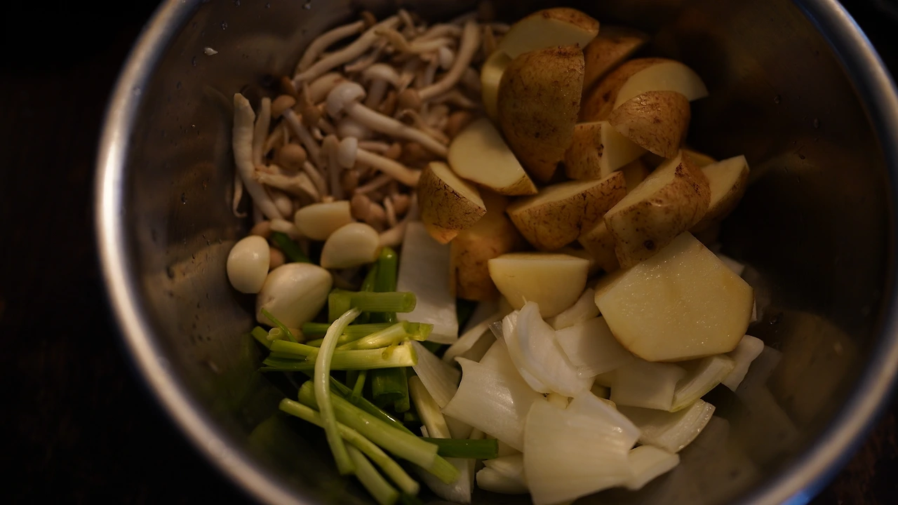 감자, 버섯, 양파, 쪽파를 먹기 좋게 손질한다. 간장, 된장, 고추장, 들깻가루, 연두, 생강청, 다진 마늘을 고루 섞어 양념을 만든다. 냄비에 물을 붓고 감자, 버섯, 양념을 먼저 넣고 끓인다. 감자가 다 익을 때 즈음 양파와 쪽파를 넣는다. 그릇에 담고 깻잎을 썰어 올린다.