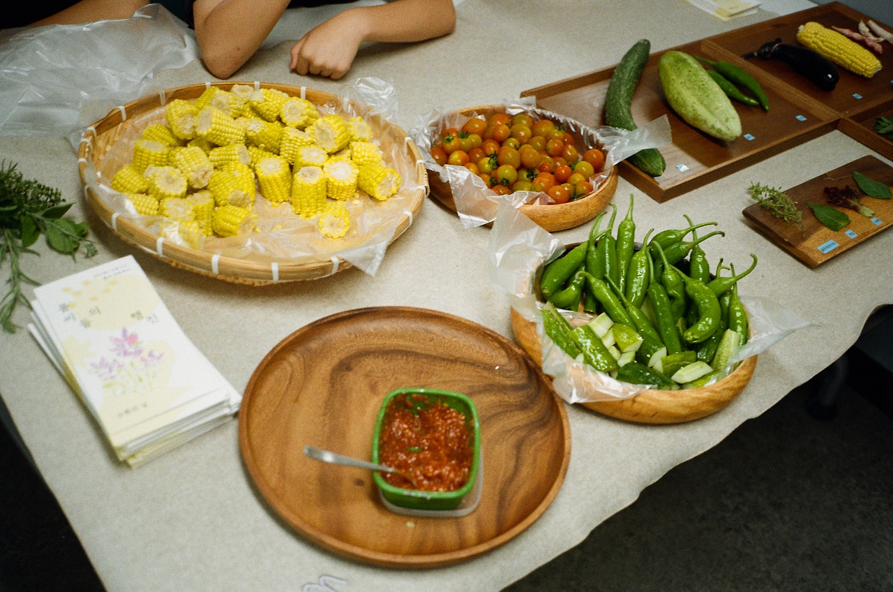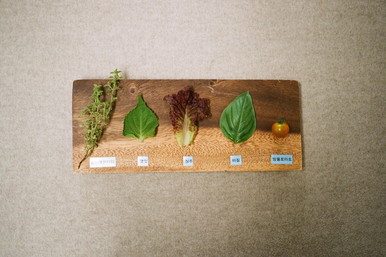 대망의 활동발표회날. 텃밭에서 작물들을 하나씩 가져와 잘 보이게 배치했다. 오이, 물외, 고추, 가지, 초당옥수수, 삼색이 강낭콩, 라벤더, 골든레몬타임, 로즈마리, 페퍼민트, 스피어민트, 깻잎, 상추. 전부 풀씨 아이들이 정성으로 가꾼 것들이다.