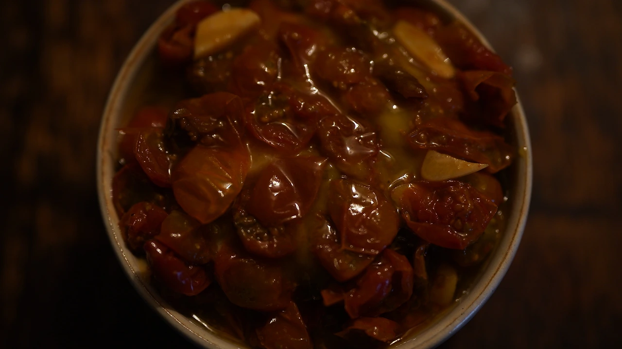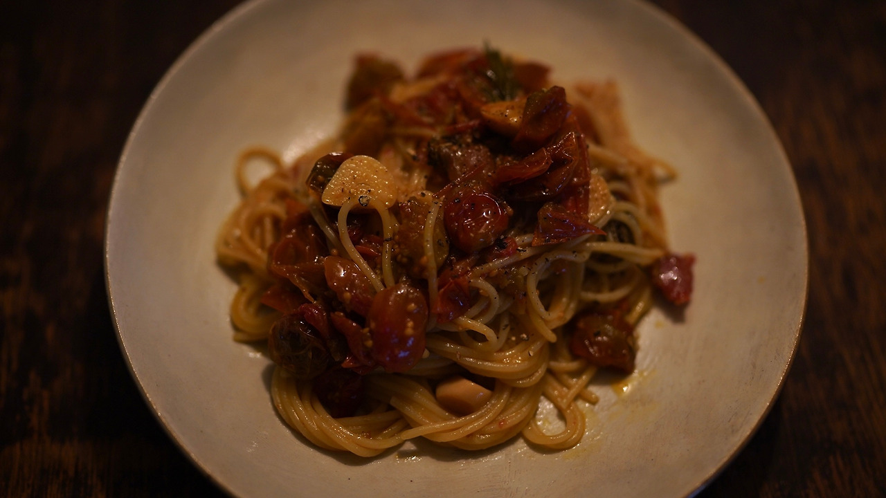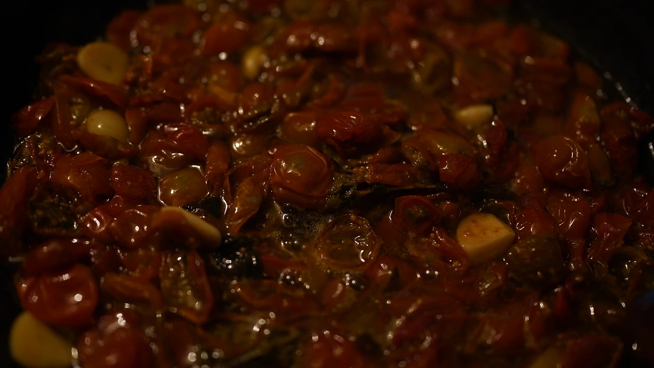 수확한 방울토마토를 햇빛에 말려 올리브유에 절여놓았다. 마늘, 연두, 허브류도 들어갔다. 팬에 방울토를 넣고 마늘이 익을 때까지 볶는다. 파스타면을 삶고 덜 익었을 때 팬에 옮겨 소스를 묻히며 마저 익힌다.