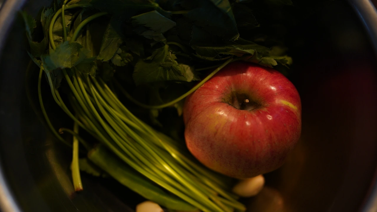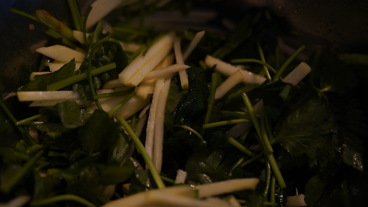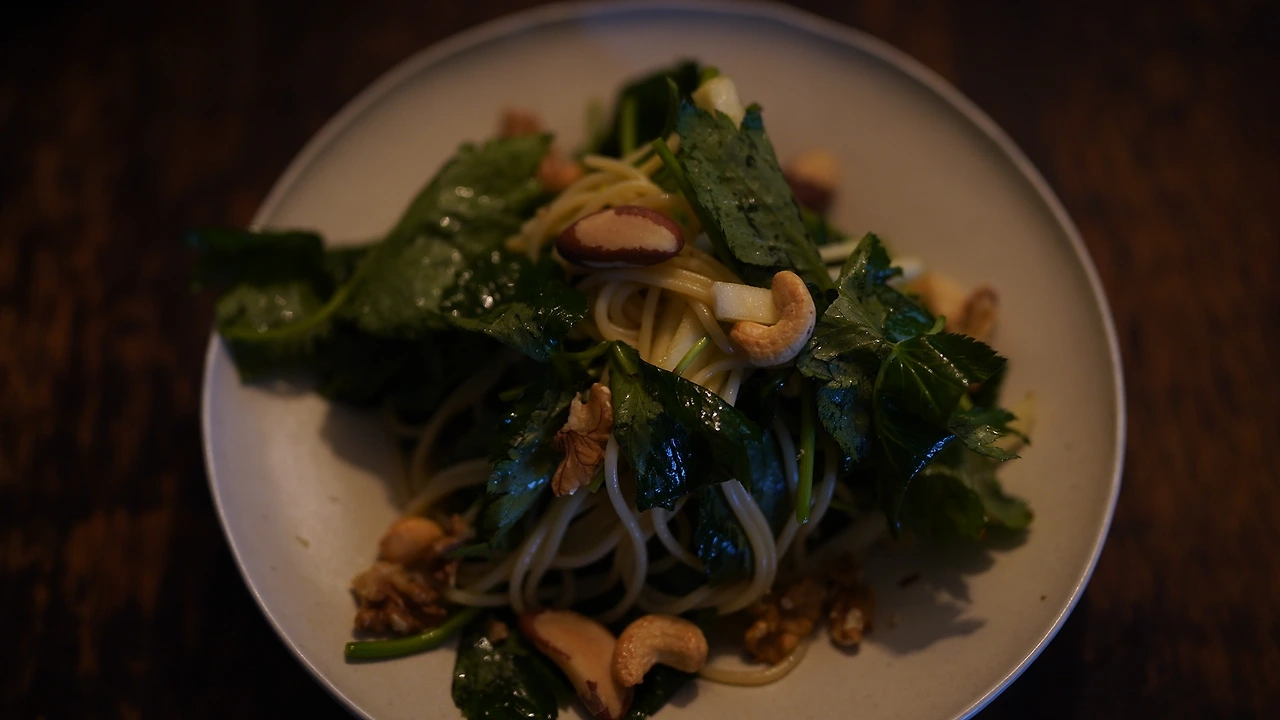 참나물과 사과를 손질한다. 볼에 오미자청, 레몬즙, 올리브유, 연두를 넣어 소스를 만들고 손질한 참나물과 사과를 미리 버무려 놓는다. 파스타면을 삶고 찬물에 헹군다. 소스와 면을 섞고 그릇에 담은 후 견과류로 마무리한다.