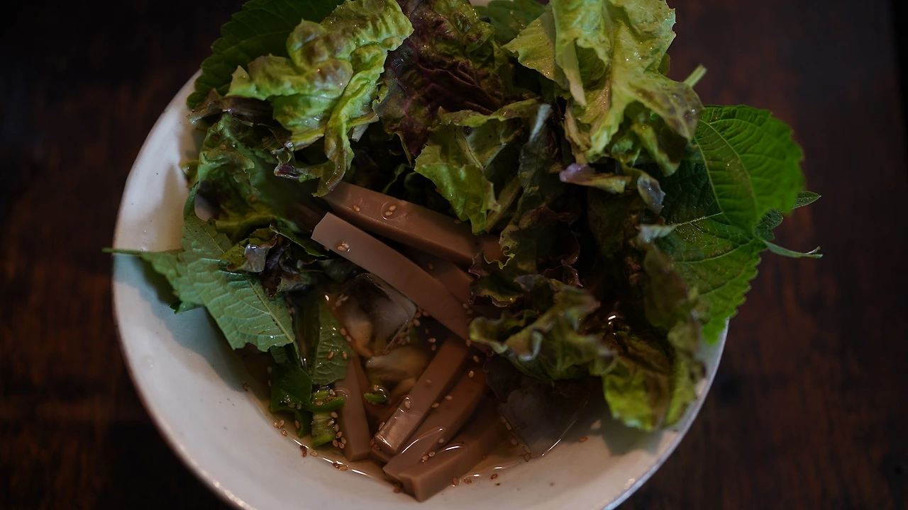도토리묵을 썬다. 물, 간장, 연두, 식초, 당류, 소금, 마늘, 땡초를 섞고 얼음을 넣는다. 그릇에 국물을 담고 도토리, 쌈채소를 올린다.