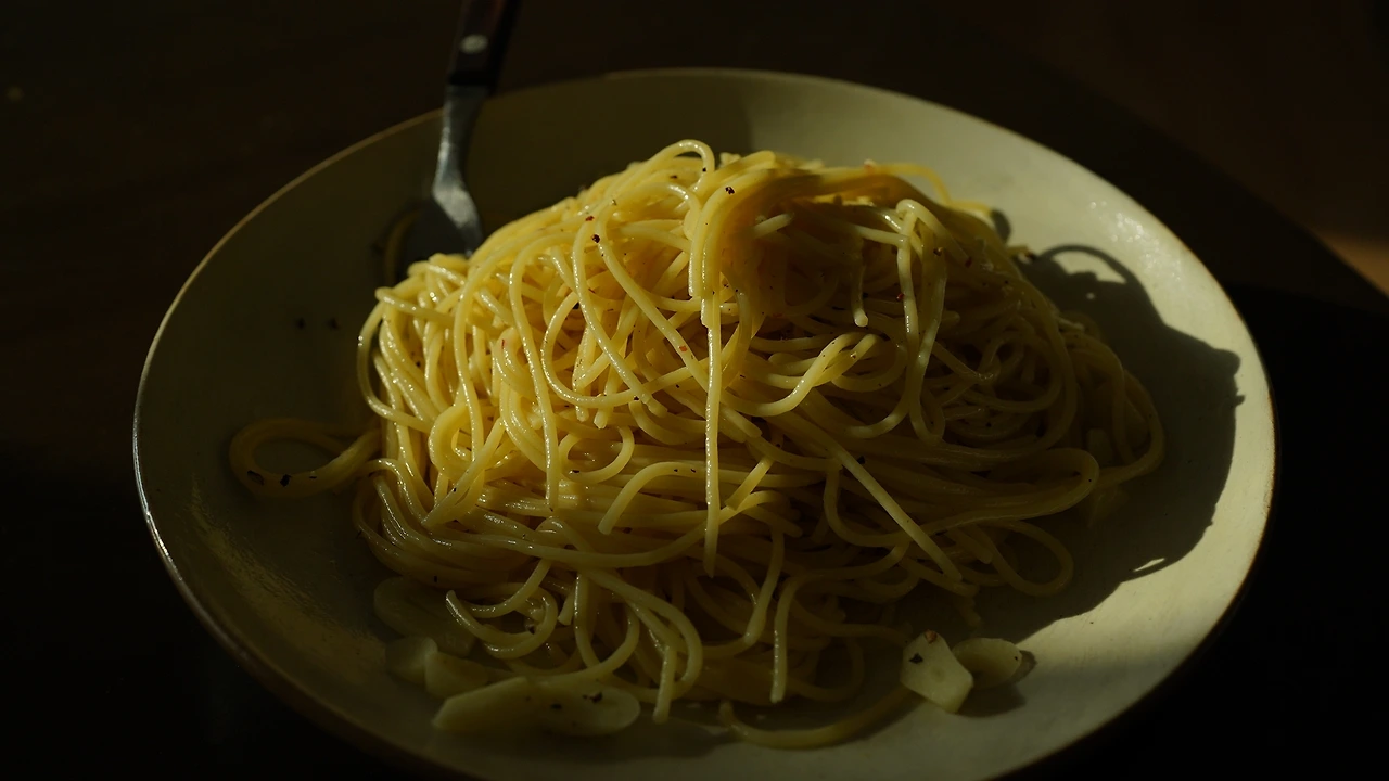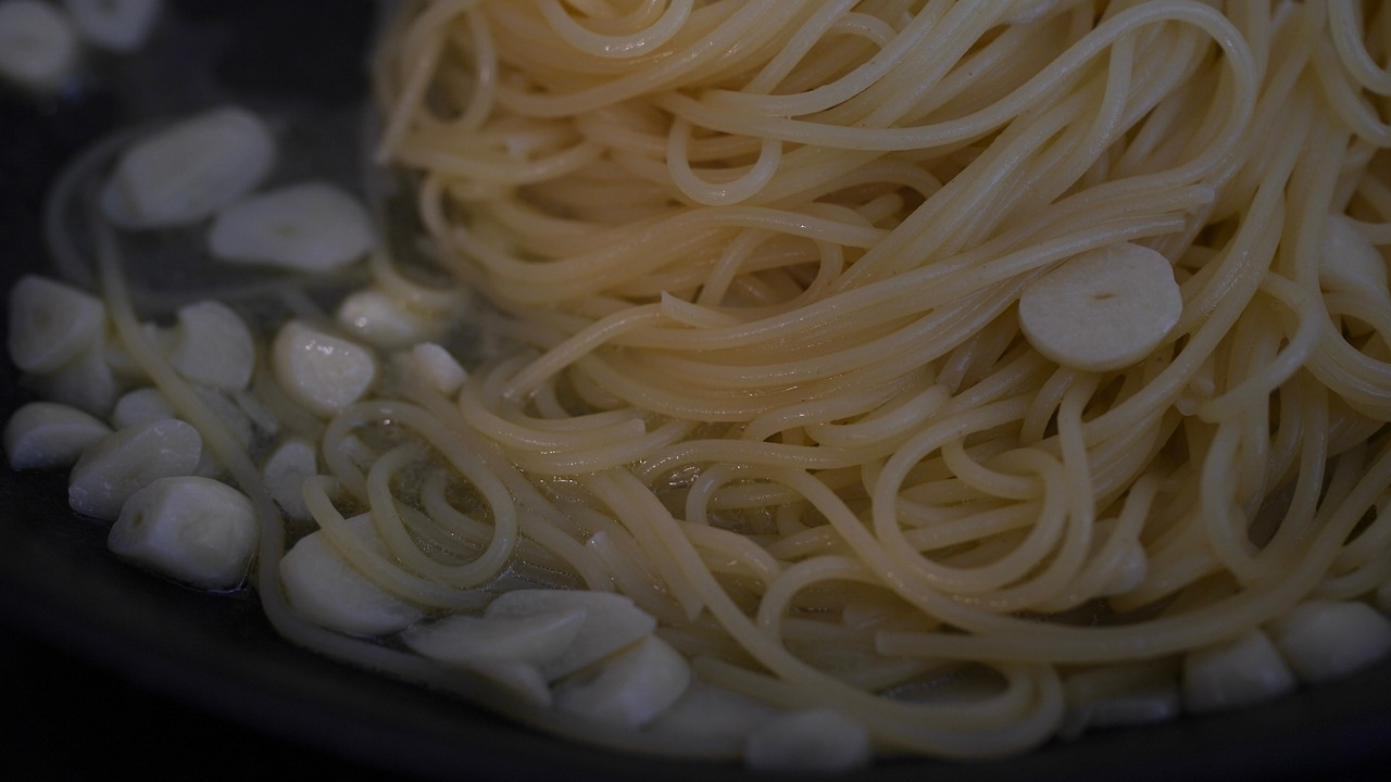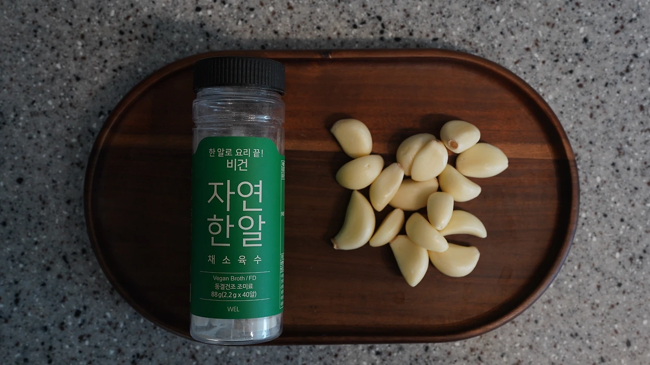 마늘 팍팍 넣어 만드는 알리오 올리오. 냄비에 물과 굵은 소금, 비건채수코인을 넣고 파스타면을 삶는다. 마늘을 굵게 썰고 팬에 올리브유와 연두를 둘러 노릇해지기 직전까지 구웠다. 팬에 면을 넣고 마늘 향이 충분히 입히면 그릇에 옮겨 담는다.