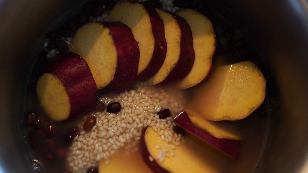 팥은 반나절 불린다. 냄비에 물과 팥을 넣고 물이 팔팔 끓으면 첫물은 따라내고 두 번째 삶을 때는 소금을 넣어 끓인다. 팥 삶은 물은 밥 지을 때 더한다. 찹쌀은 10분 정도 불리고 평상시보다 물을 적게 잡았다. 고구마는 밥 지을 때 익을 만큼 두께로 어림잡아 썰었다.