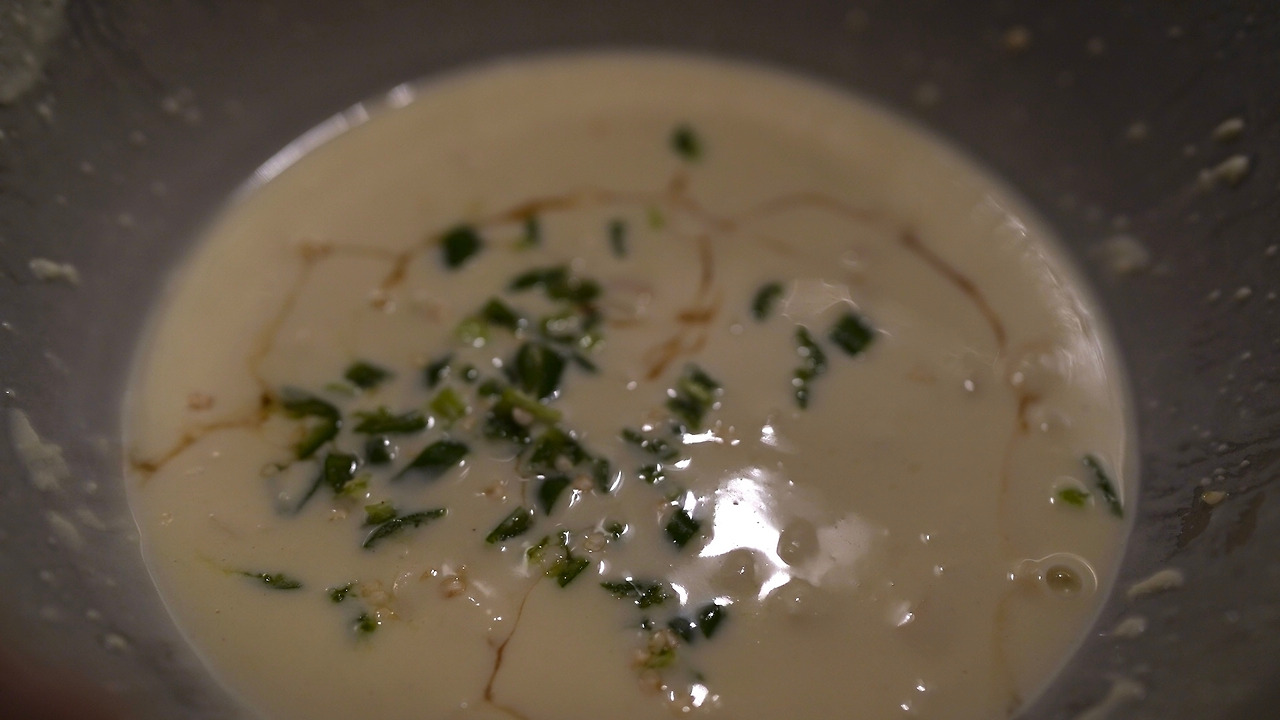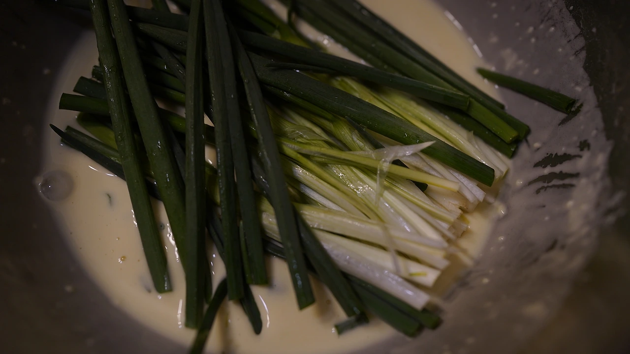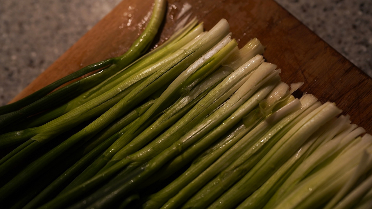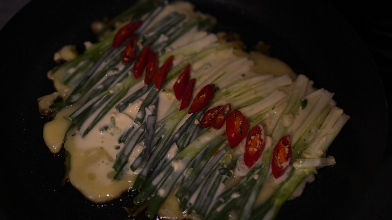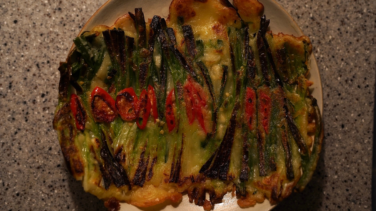 쪽파는 이등분을 하고 하얀 부분은 칼질을 해 펼쳐지도록 손질한다. 볼에 물, 부침가루, 연두, 다진 마늘, 다진 땡초를 넣고 섞는다. 반죽 간은 짭짤하게 한다. 파에 반죽을 가볍게 입힌다. 팬에 기름을 두르고 강불에 두었다가 파를 나란히 올려 굽는다. 가운데는 홍고추를 올려 먹음직스러운 모양을 만들었다. 간장이랑 식초, 고춧가루 섞어둔 장에 찍어먹는다.