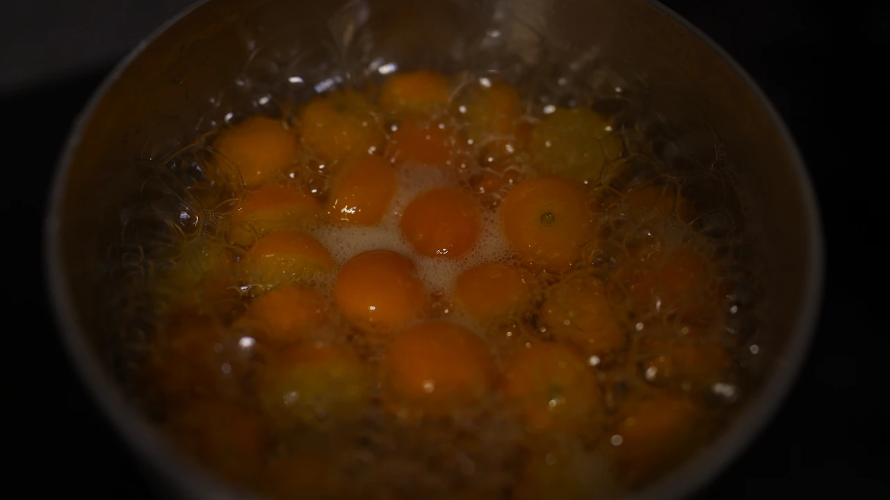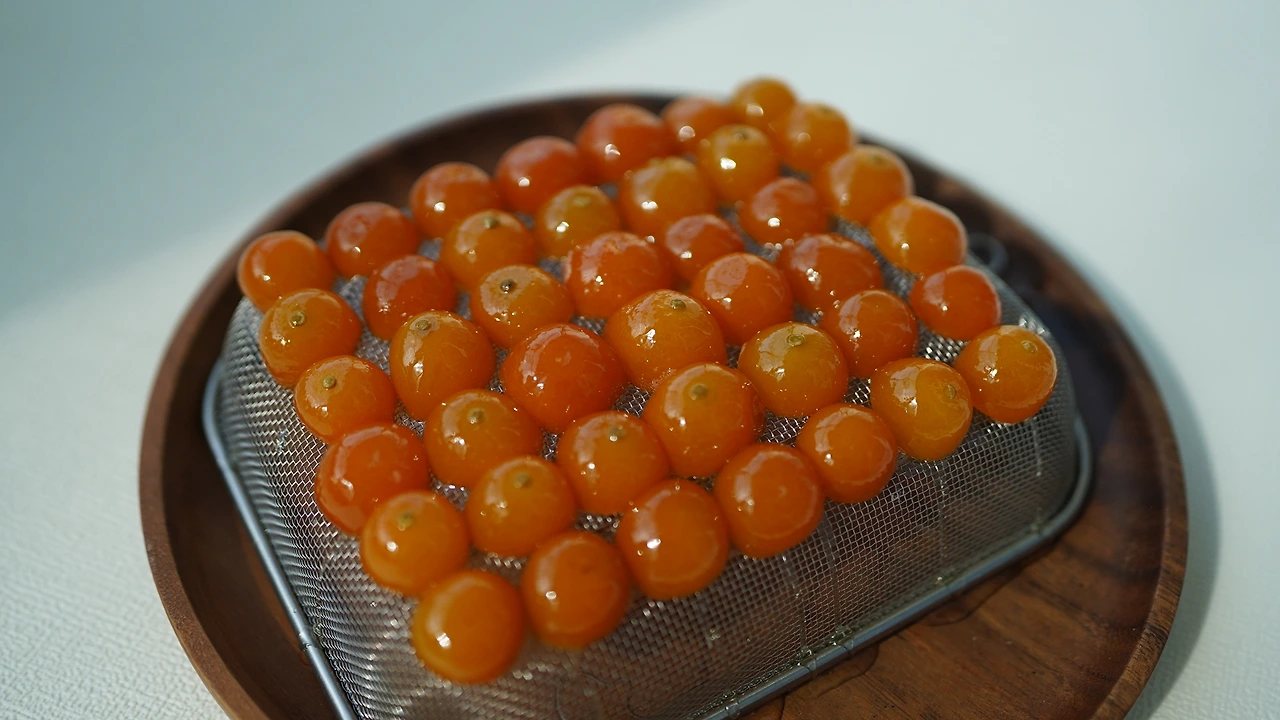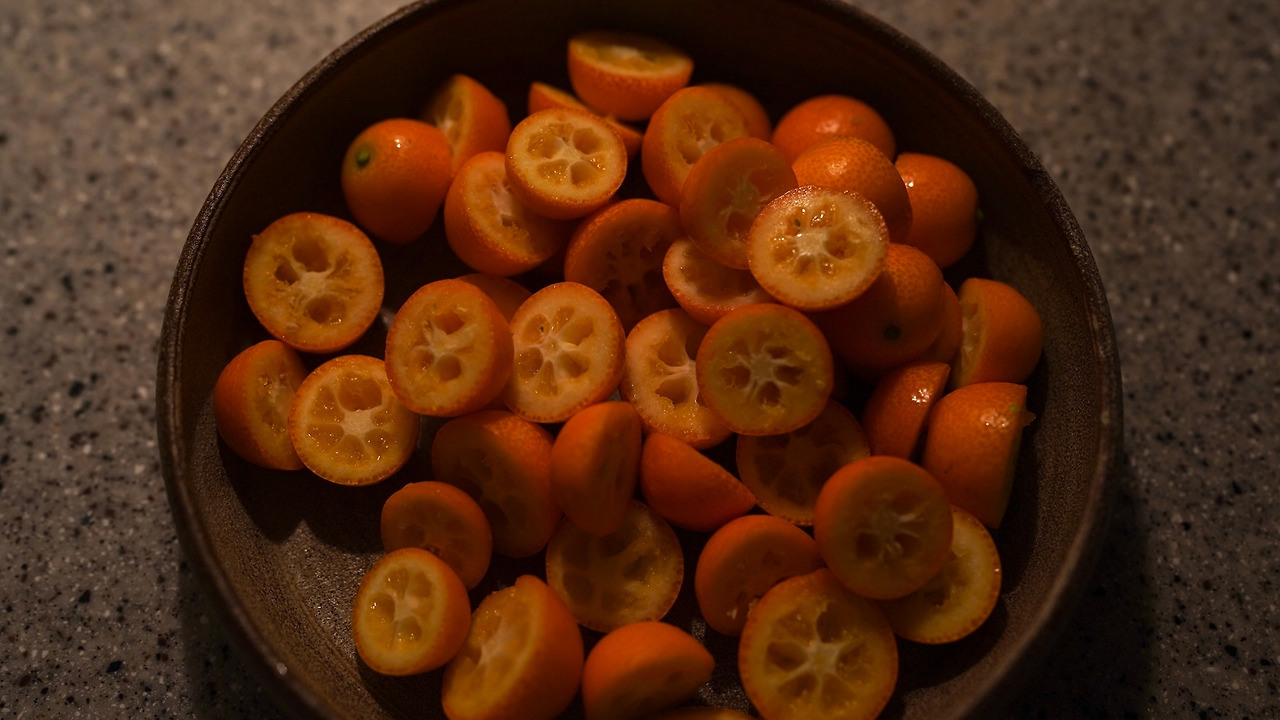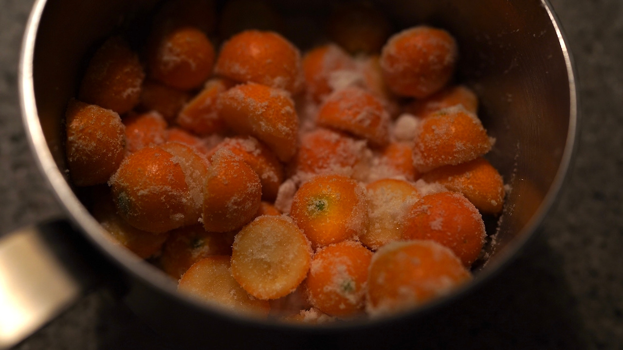 금귤을 베이킹소다로 세척하고 칼로 반을 썰어 씨를 빼낸다. 손질한 금귤과, 금귤의 1/3 무게의 당류를 섞어 하루 동안 실온에 놔둔다. 냄비에 당류에 절인 금귤과 물을 넣고 끓인다. 팔팔 끓으면 중약불로 줄여 5-10분 끓이고 완전히 식힌다. 끓이고 식히는 과정을 세 번 반복하고 거품은 매번 걷어낸다. 이제 햇볕에 말리기 시작했다. 보석처럼 윤이 나는 모습에 시선을 떼기 힘들다.