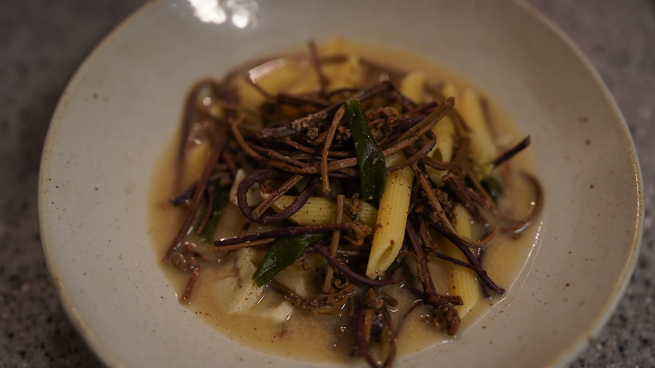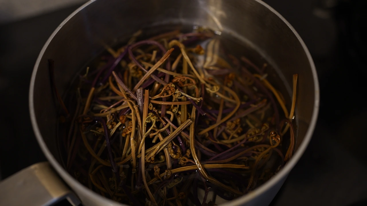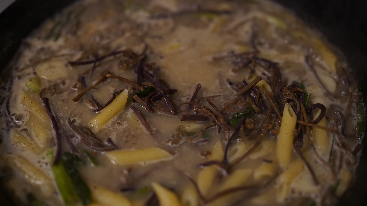 예전에 제주에서 공연했을 때 관객분이 직접 따다 말린 거라며 주신 고사리다. 고사리를 반나절 물에 불리고 냄비에 물과 고사리를 넣어 팔팔 끓인다. 마늘과 쪽파를 손질하는데 쪽파는 파스타면 길이로 맞춰 썰었다. 팬에 참기름을 두르고 마늘과 쪽파를 볶는다. 채소에 기름향이 잘 입혀지면 고사리를 넣고 조금 더 볶다가 물과 들깨가루를 더해 끓인다. 파스타면은 소금물에 따로 끓이다가 심이 꽤 단단할 때 팬에 옮겨 고사리 국물과 함께 끓인다. 간은 연두로 했다. 한식파라면 좋아할 파스타.