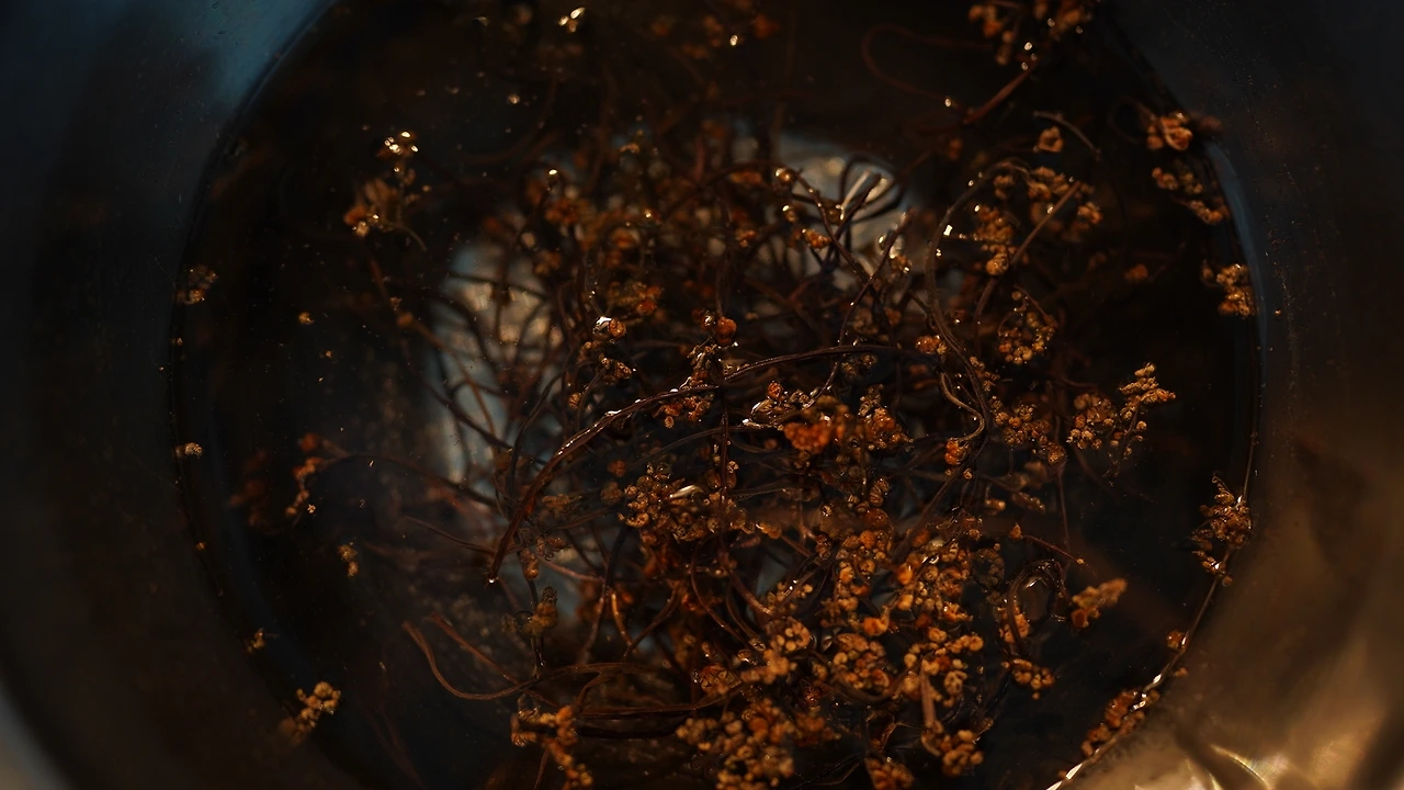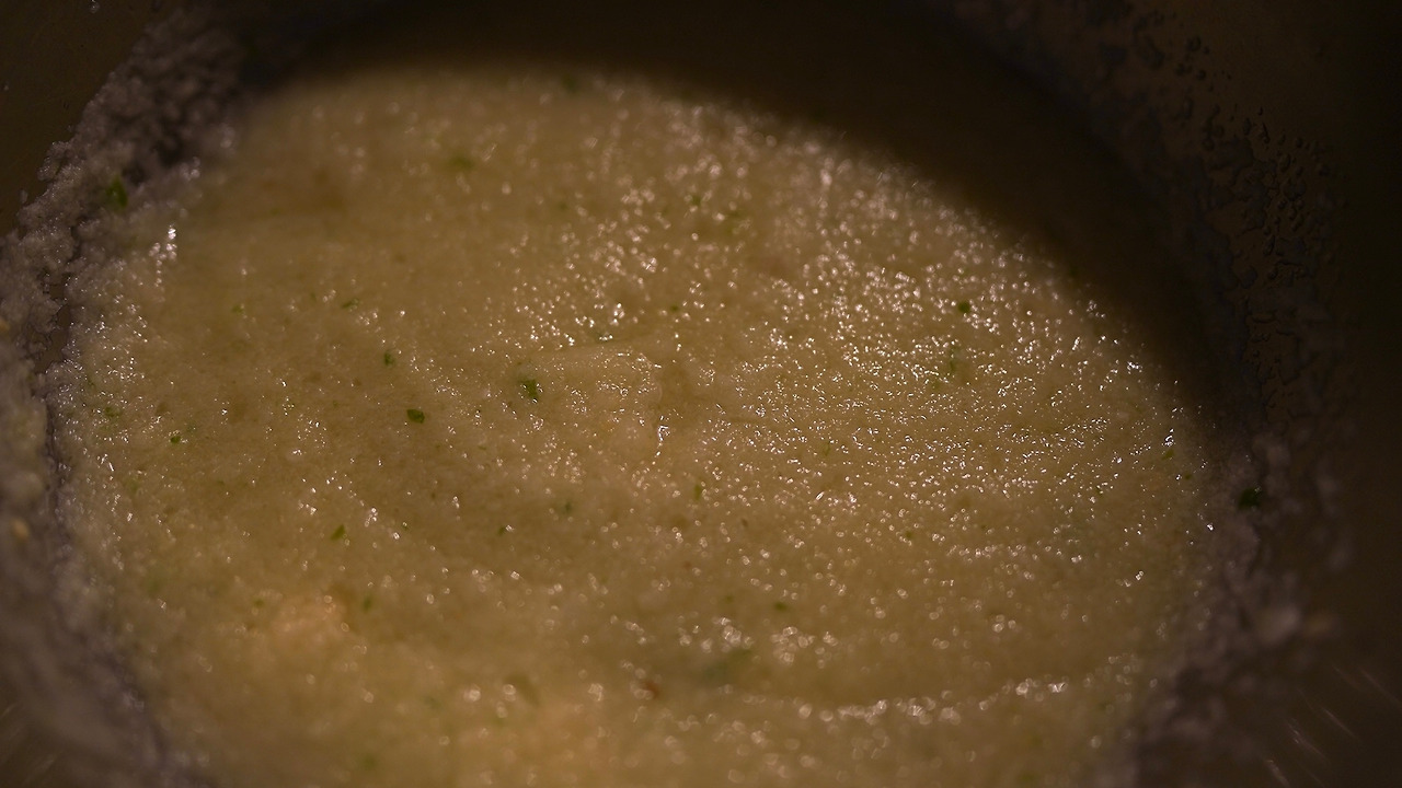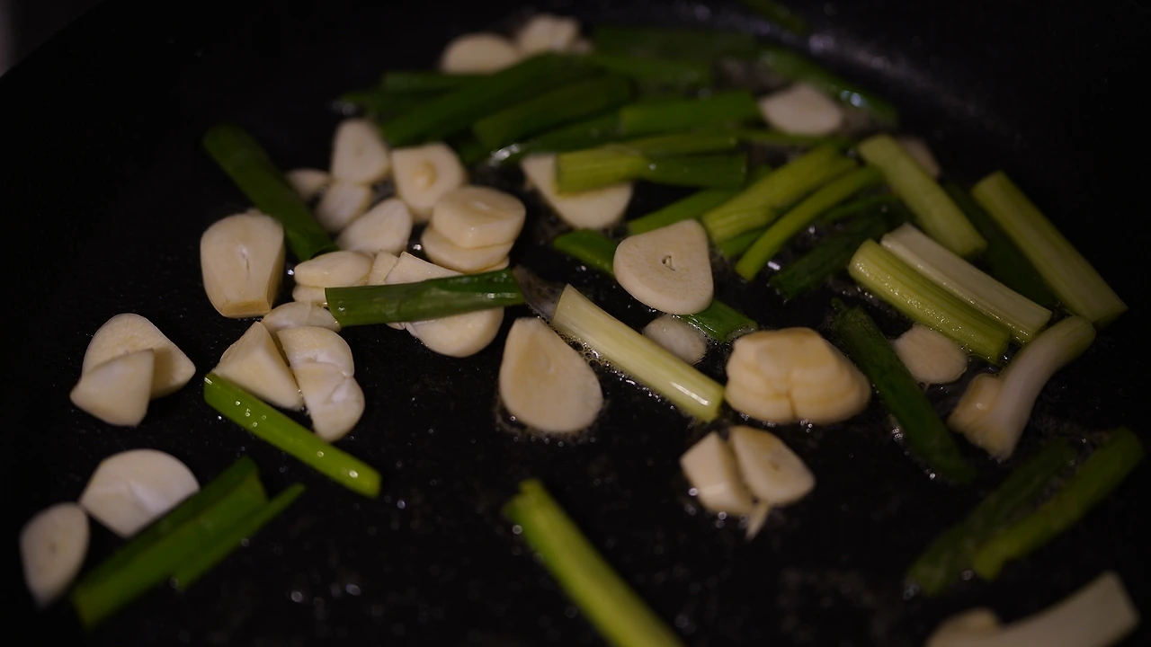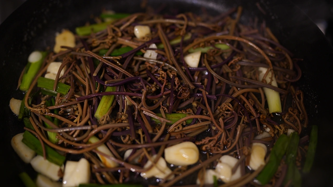 예전에 제주에서 공연했을 때 관객분이 직접 따다 말린 거라며 주신 고사리다. 고사리를 반나절 물에 불리고 냄비에 물과 고사리를 넣어 팔팔 끓인다. 마늘과 쪽파를 손질하는데 쪽파는 파스타면 길이로 맞춰 썰었다. 팬에 참기름을 두르고 마늘과 쪽파를 볶는다. 채소에 기름향이 잘 입혀지면 고사리를 넣고 조금 더 볶다가 물과 들깨가루를 더해 끓인다. 파스타면은 소금물에 따로 끓이다가 심이 꽤 단단할 때 팬에 옮겨 고사리 국물과 함께 끓인다. 간은 연두로 했다. 한식파라면 좋아할 파스타.