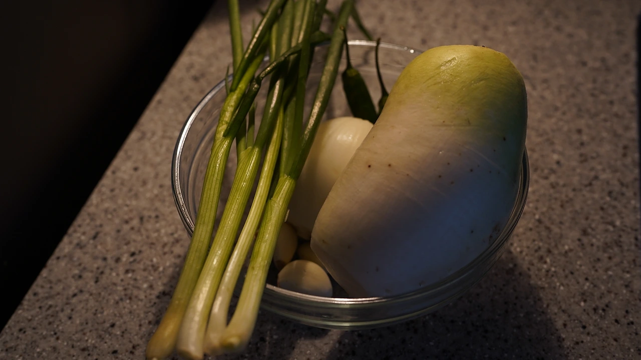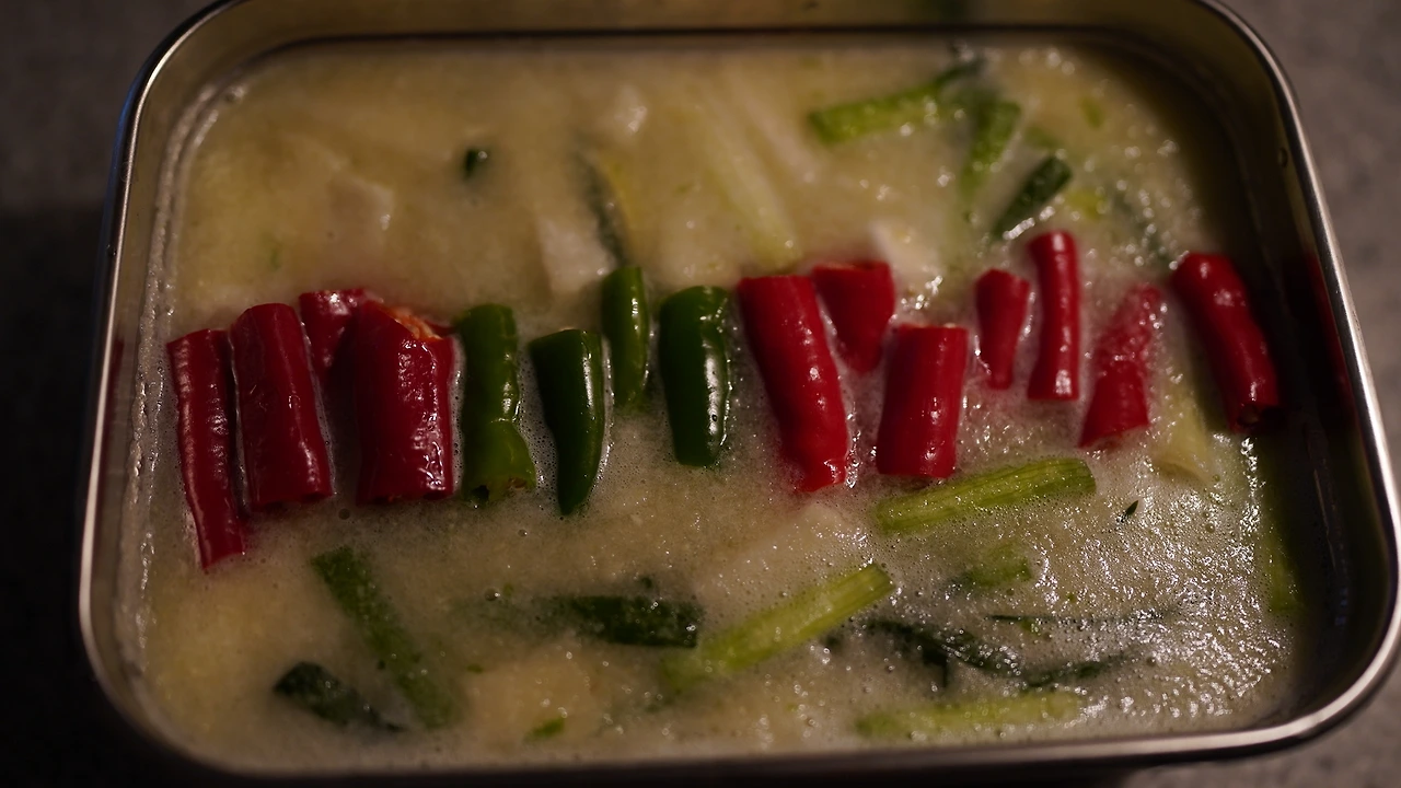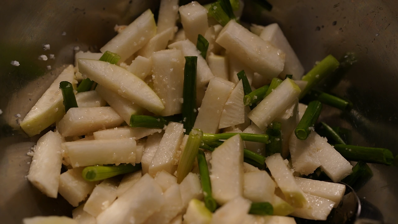 무와 쪽파를 썰어 굵은소금에 절인다. 무에서 나온 물도 쓰려고 소금을 많이 넣지는 않았다. 마늘, 땡초, 양파, 생강, 사과, 배, 물, 갈아 만든 배 음료를 믹서에 간다. 맑은 국물을 쓰려면 걸러내야 한다는데 따로 거르지는 않았다. 하루 상온에 두었다가 냉장보관한다. 사이다 대신 동치미.
