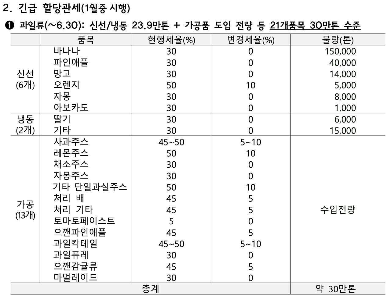 기획재정부 문서에 따르면 수입 과일류 관세를 0%로 수입해오기로 했다.