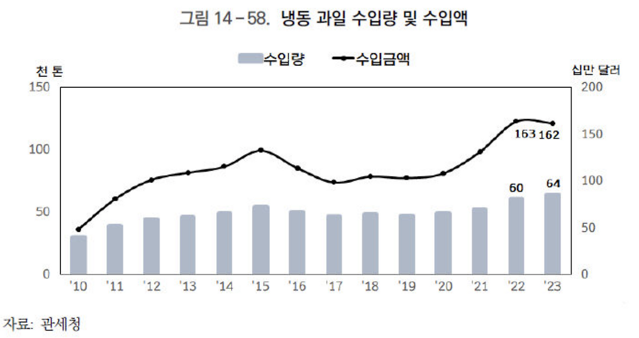 출처 : 관세청냉동과일의 수입량이 역대급으로 많아지고 있다. 국산과일의 공급량이 감소하면서 가격이 상승하였고 냉동과일을 소비하고 있는 것을 보여준다. 냉동과일의 장점은 저장하기 편리하다는 점이고 1인가구들도 오래두고 먹을 수 있다는 장점이 있다. 실제로 대형마트에 가면 과일코너 옆에 냉동과일을 배치해두었고 블루베리 종류가 가장 많이 팔리는 것을 마트에서 눈으로도 확인할 수 있었다.