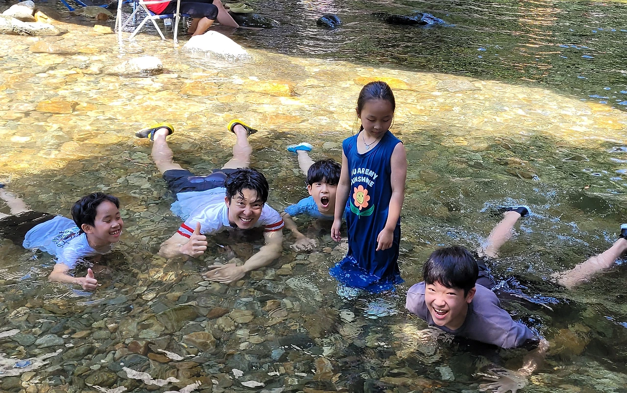 아이들과 찬 계곡물에 몸 담그기 게임을 했다.
