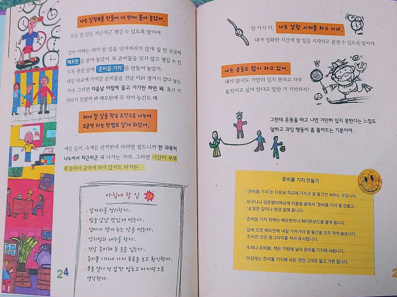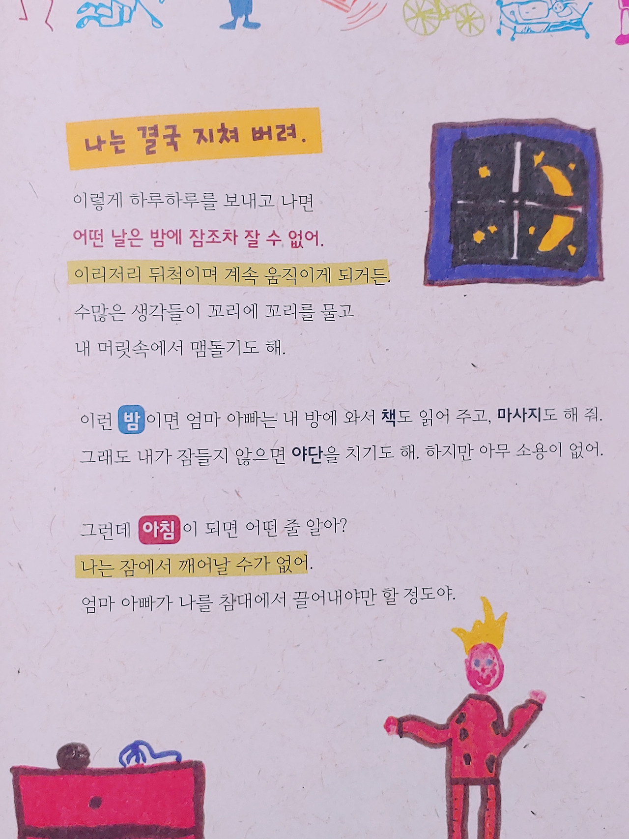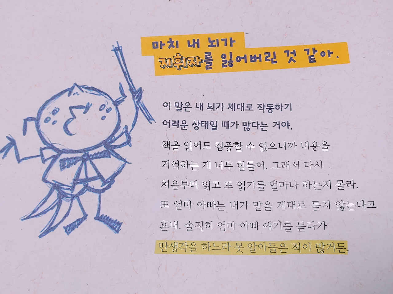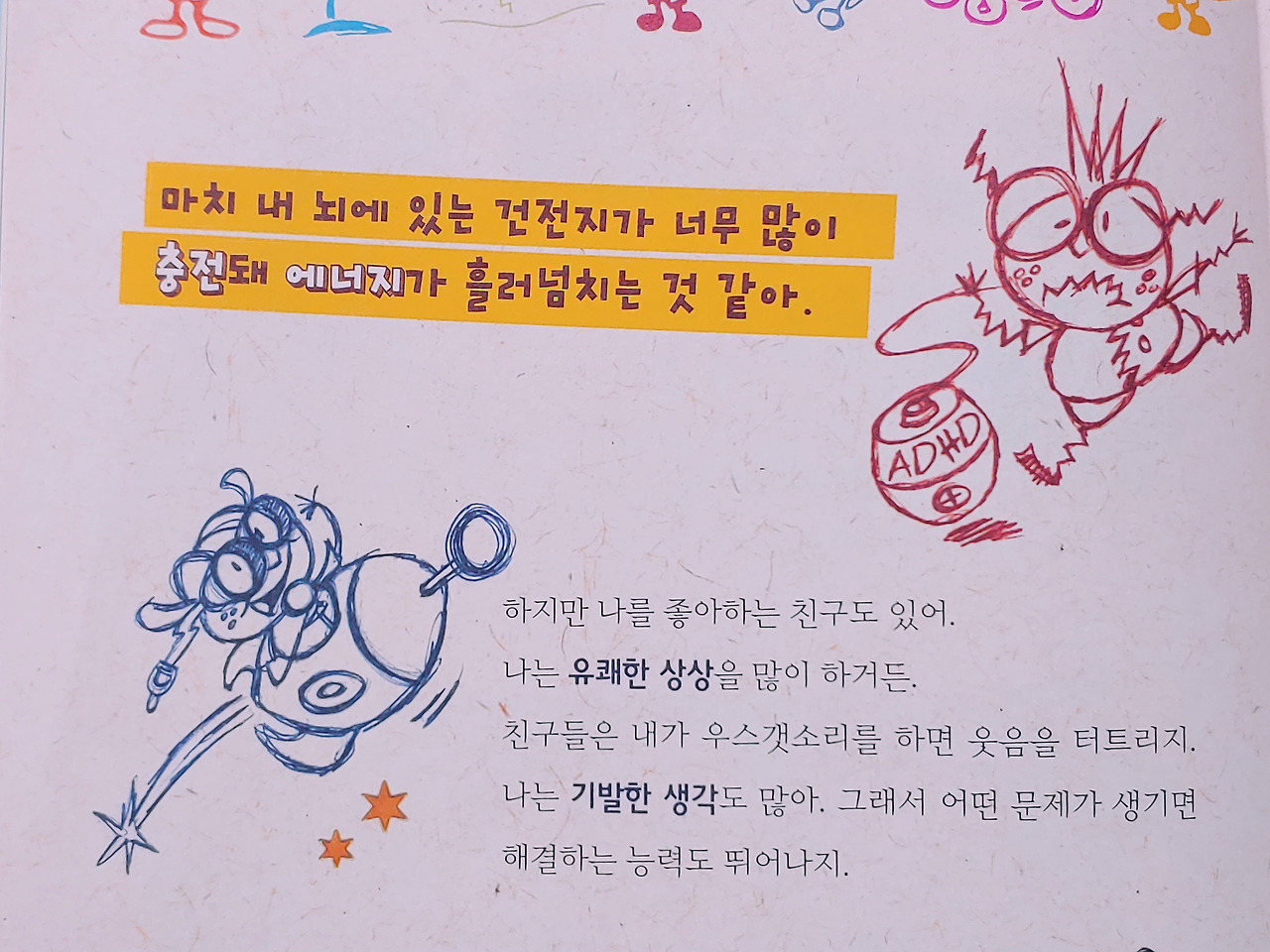 톰은 adhd를 자세하면서도 쉽게 알려준다. 정보의 나열은 자칫 어려울 수 있는데, 상황에 맞는 그림이 흥미를 끌고, 글씨를 오려 붙인듯한 강조 효과를 통해 아이가 조금 더 이해하기 쉽게 설명하고 있다. 그래서 아이는 충분히 정보를 받아들였고, 이 책의 주인공 톰과 공감했다.