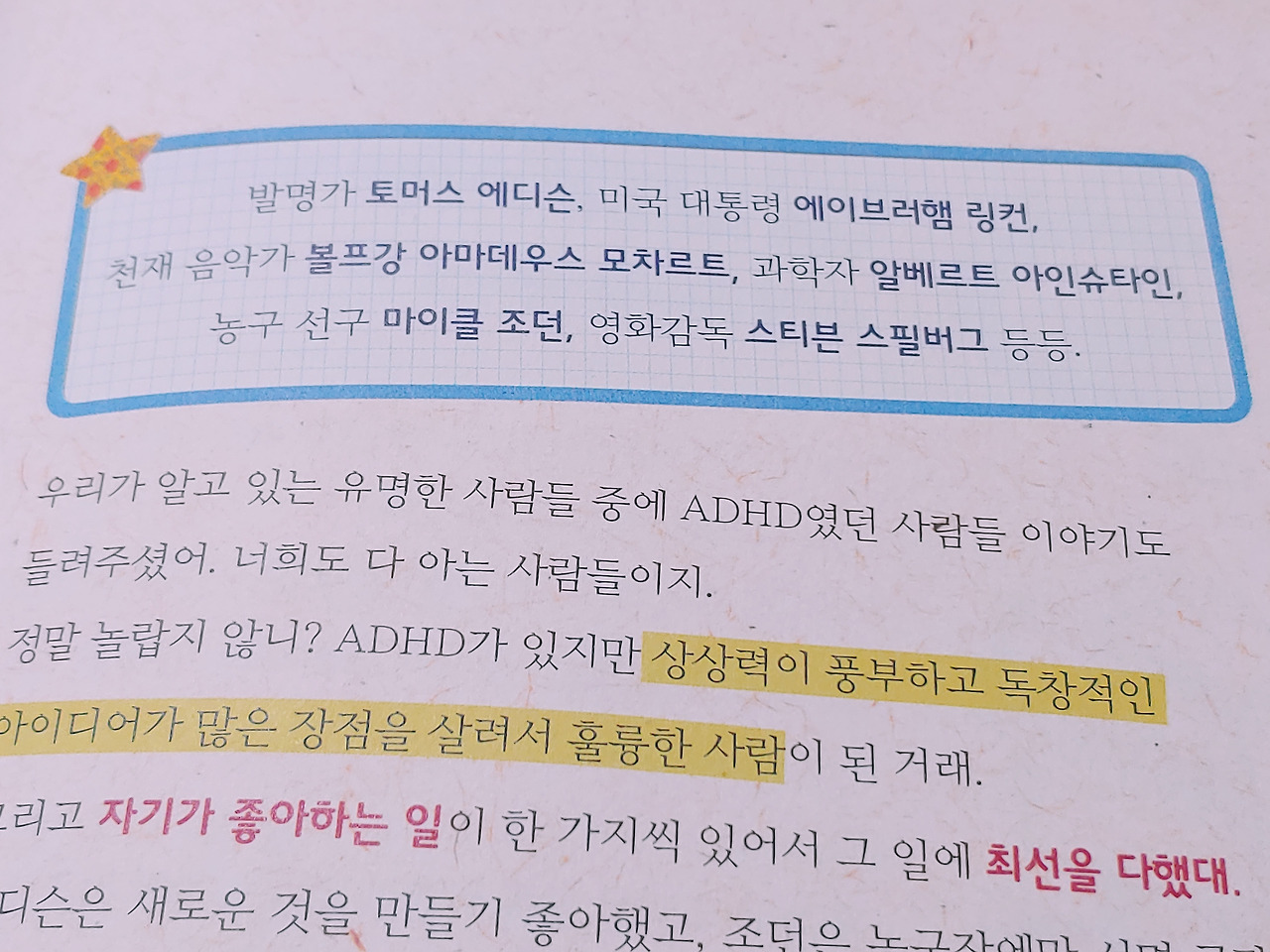 희망이 있다. adhd에 잠식되면 사회 부적응자로 살아갈 수도 있지만, adhd를 극복한 사람들은 위인이 된다. 이 세상은 이런 소수에 의해 발전했다. 사회에 적응한 보통 사람들이 기발한 생각을 해서 세상을 발전시킨 것이 아니라, 말도 안 되는 생각들로 개혁을 이루어낸 소수의 특이한 사람들이 위대한 업적을 남겼다. 우리 아이도 당연히 그렇게 될 수 있다. 그렇게 되지 않더라도, 유쾌한 삶을 살 수 있다. 내가 원하는 일을 하며, 원하는 대로 살아가는 멋진 사람이 될 수 있다. 그 가능성을 절대 잊지 말길 바란다.