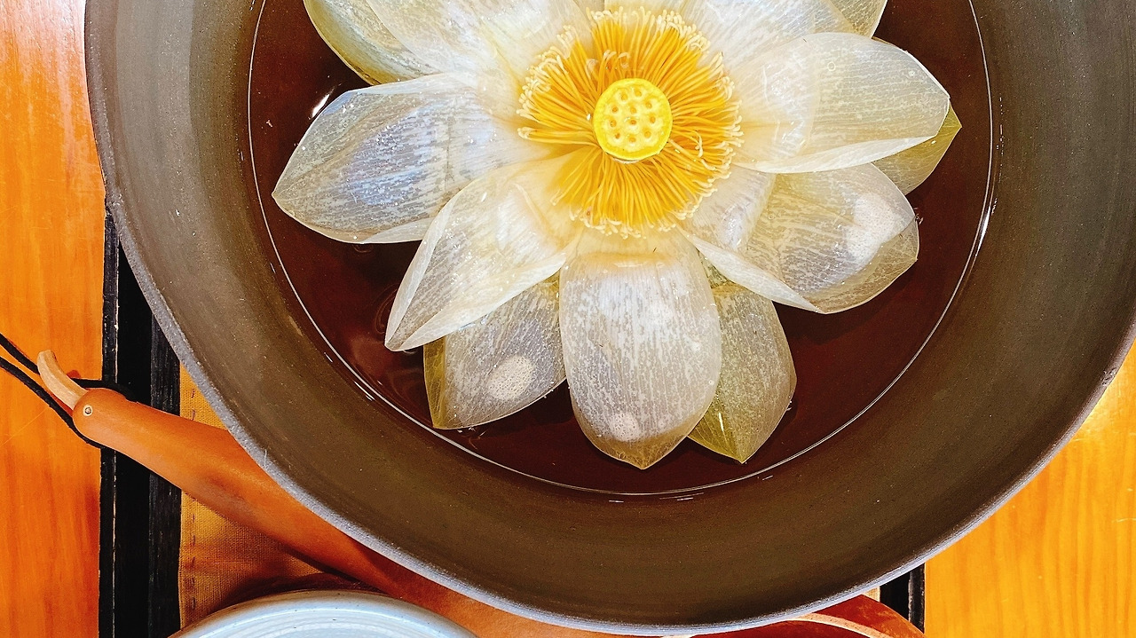 드디어 찻잔 속에 연꽃 한 송이가 활짝 피어나고, ‘눈 호강’이라는 게 이런 걸 두고 하는 말이지 않을까, 연신 감탄하며 신기해했다. 우윳빛 연꽃 담긴 사발을 사이에 두고 담소를 나누자니 분위기마저 정숙해져 천천히 쉬엄쉬엄. 그렇게 차 맛을 음미했다.