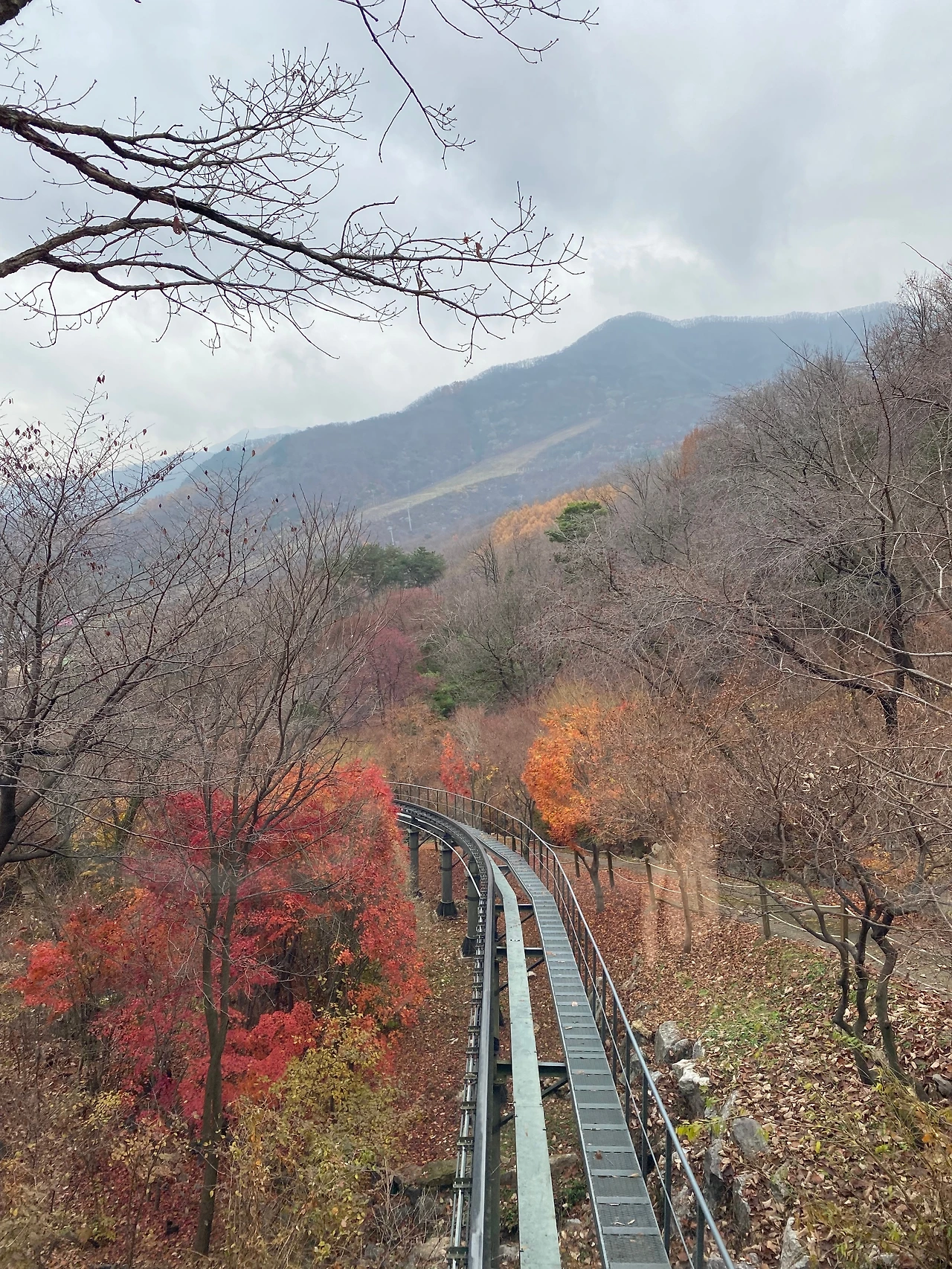 11월 중순이라 잎을 반쯤 털어낸 나무들이 앙상한 빈 가지를 꽤나 드러내고 섰다. 밑에서 올려다보면 잘 볼 수 없는 우듬지가 눈 아래로 스쳐 지나간다. 떠나는 가을을 오래 간직하라고 최대한 느릿느릿 공간을 접는 마음을 읽는다. 점점 뒤로 멀어지는 풍광에 탄성이 터져 날 때마다 떡 벌어진 입안으로 가을이 삼켜지고 물감을 쏟아부은 듯한 단풍에 눈마저 호사스럽다. 올려다보는 것보다 내려다보는 것에 기분이 더욱 업 되는 까닭은 신분상승에 목을 매는 인간의 속성과도 같은 맥락일까.