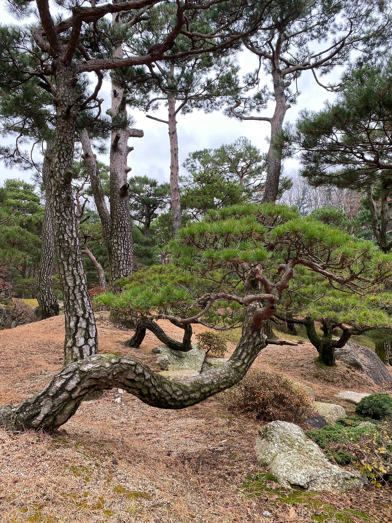 소나무 숲으로 들어섰다. 끊임없이 이어지는 소나무들의 자태가 어느 한 그루도 기이하지 않은 게 없다. 선의 미학에 감탄하며, 이 나무들을 돈으로 환산하면 얼마나 어마어마한 자산이 될까?
