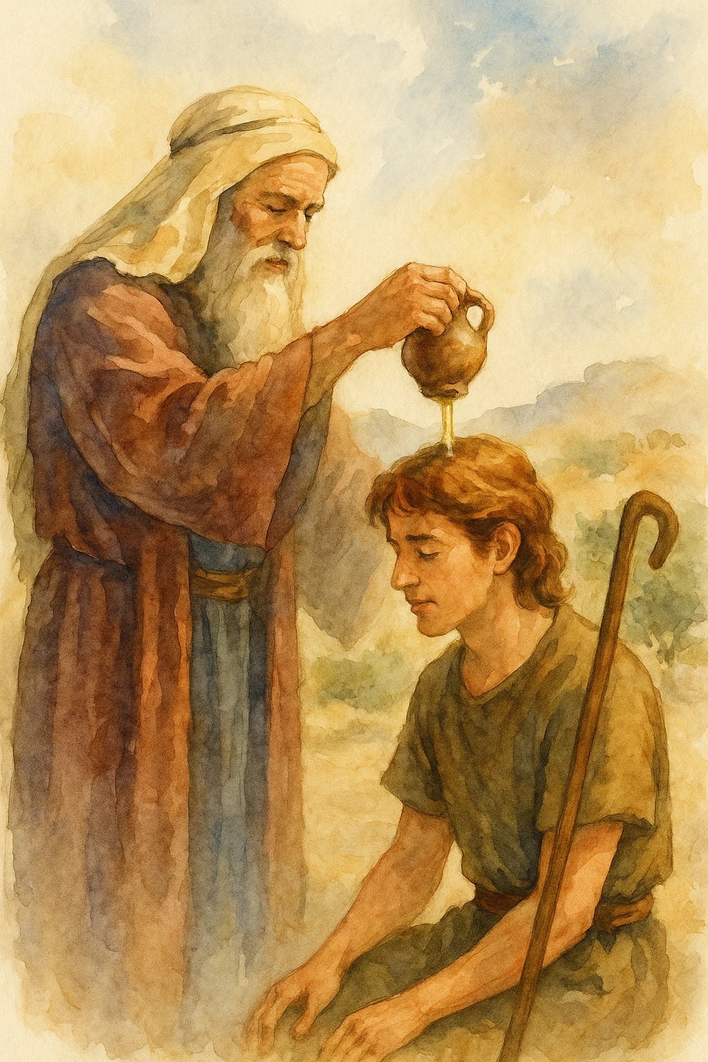사무엘은 기름을 담은 뿔을 가져다가 다윗에게 기름을 부었어요.