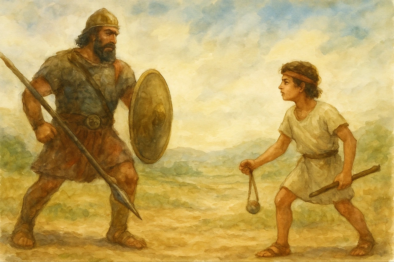다윗은 블레셋 장수를 이겼지만 손에는 칼이 아니라 짱돌 하나와 무릿매만 들려 있었지요.