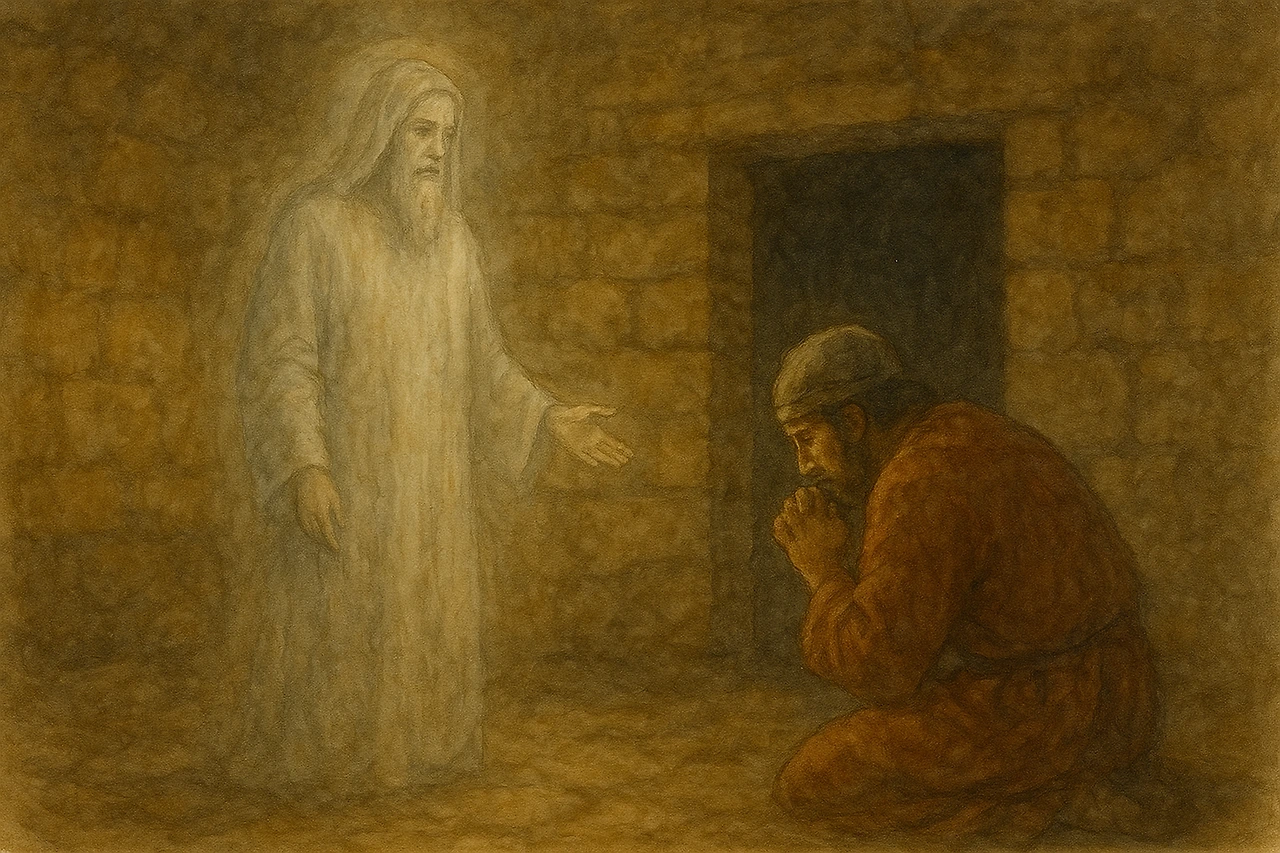 왕은 그 여자를 잘 타이르고는 땅에서 올라온 사무엘 앞에 얼굴을 땅에 대고 절하였어요.