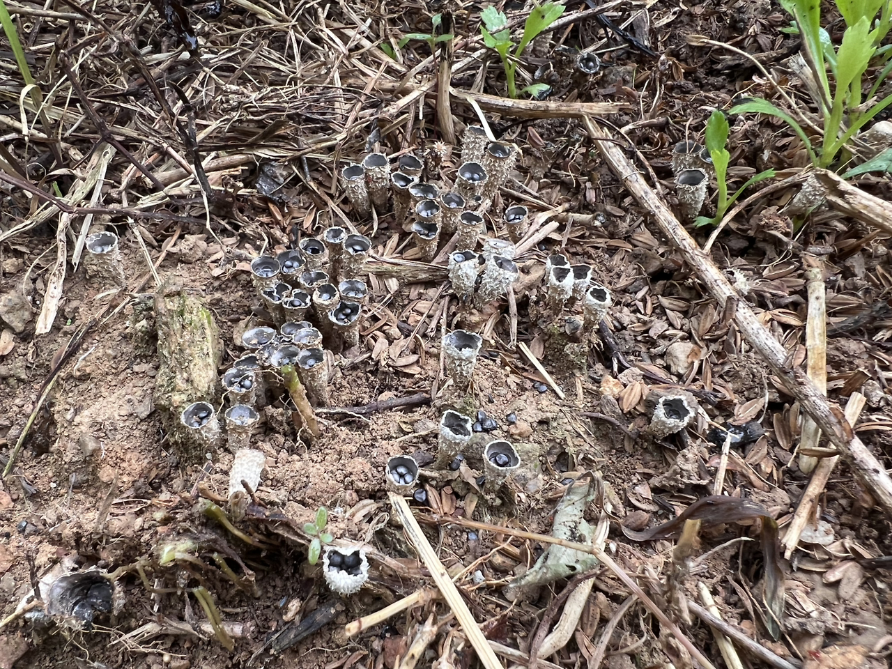 최근 많은 비가 내린 때문에 잡초들의 기세가 등등해져 구절초 심은 이랑에도 잡초가 구절초를 가리기 시작했다. 그래서 다시 한번 잡초를 정리했다. 잡초를 정리하는 중에 씨앗이 담긴 작은 주머니가 촘촘히 모여있는 것을 발견했다. 이건 뭐지? 쇠뜨기 포자는 아닐텐데. 사진을 찍어놓았다가 검색을 해보니, 좀주름찻잔버섯이라고 한단다.