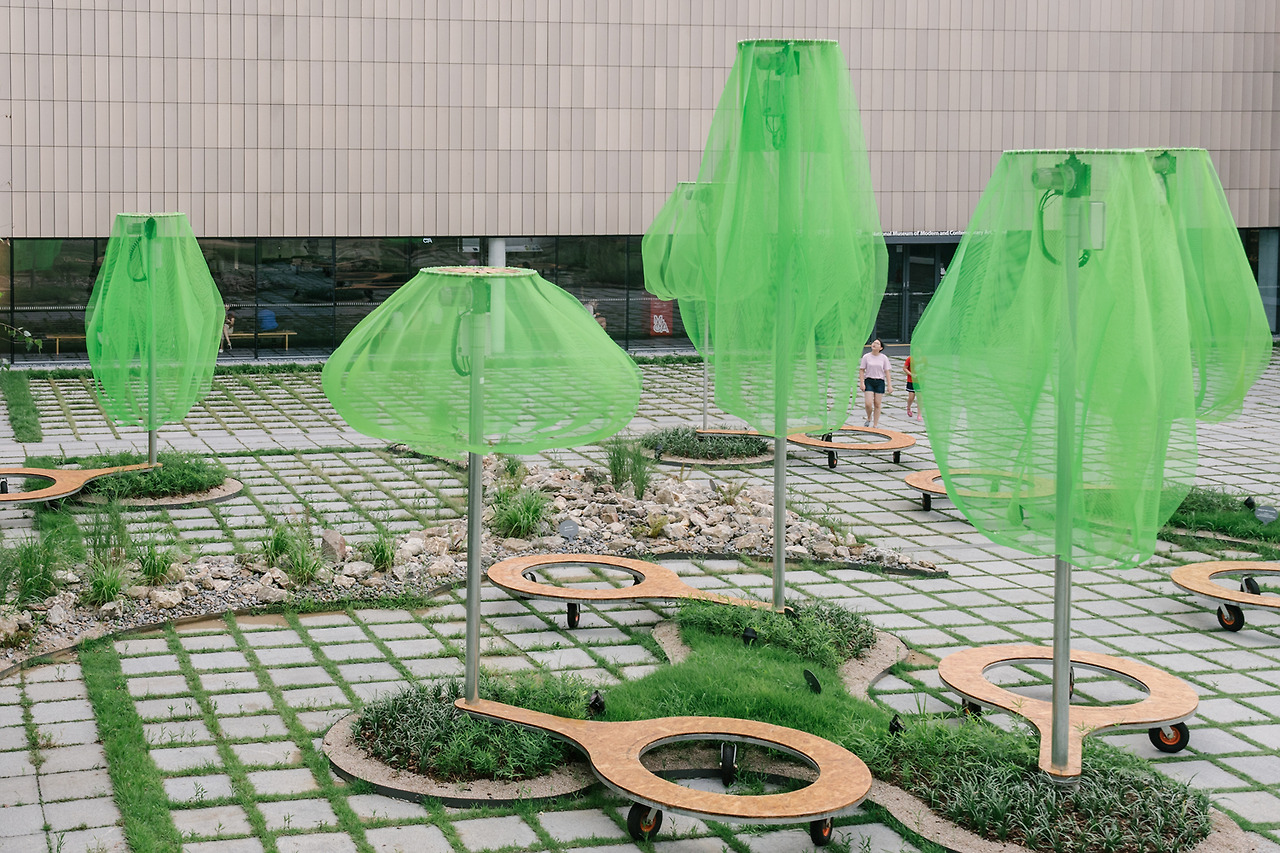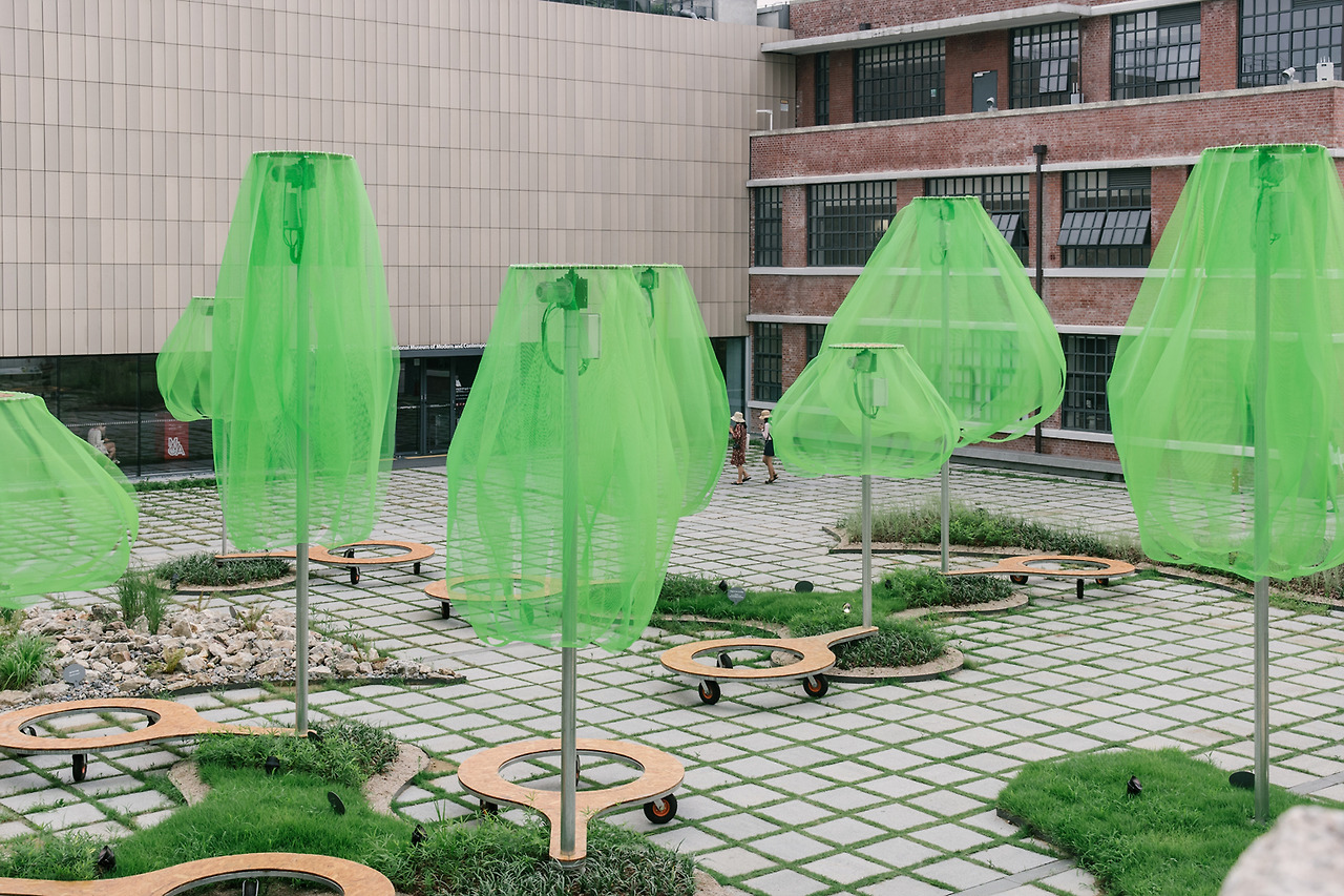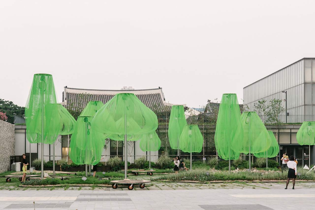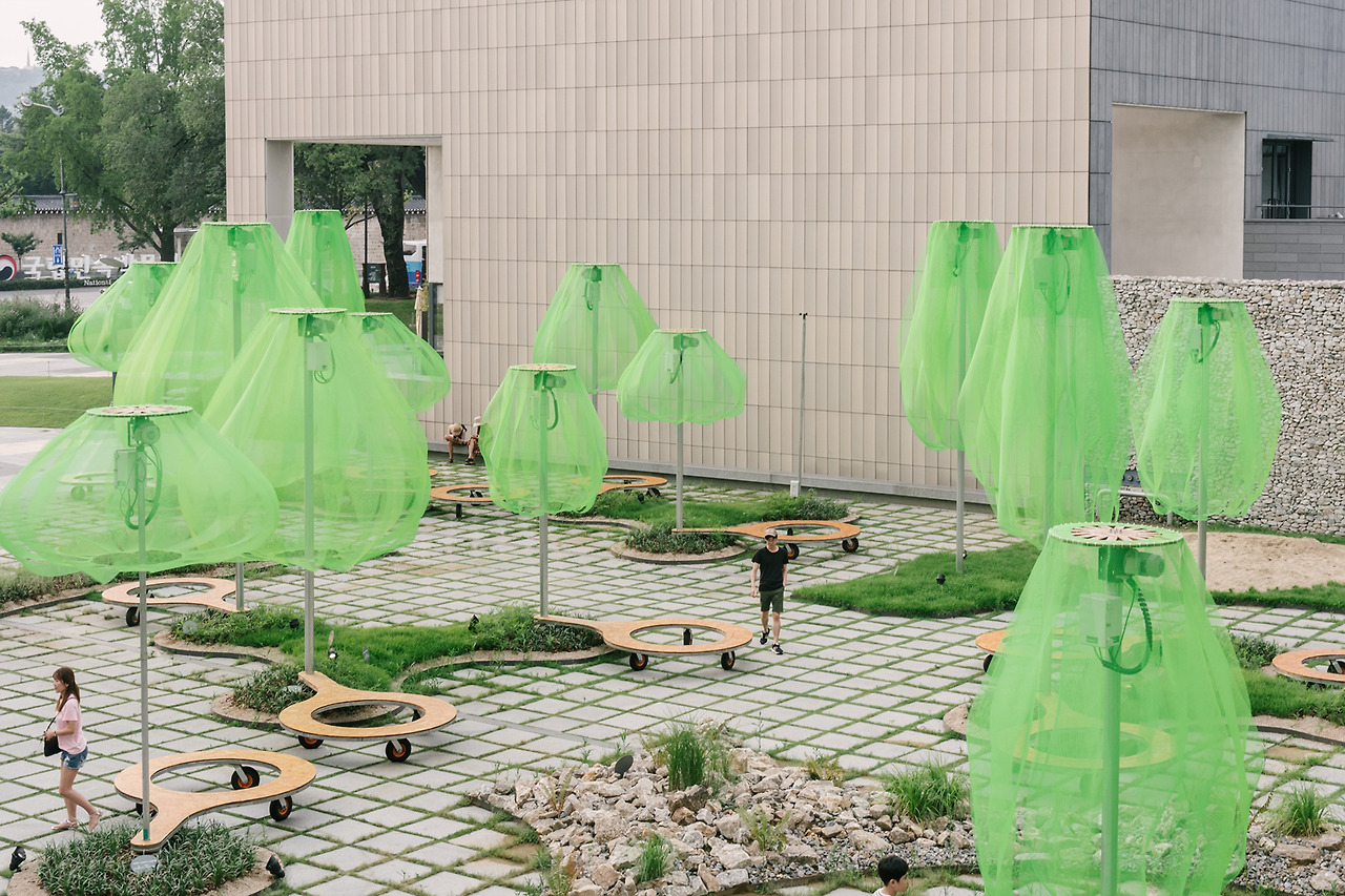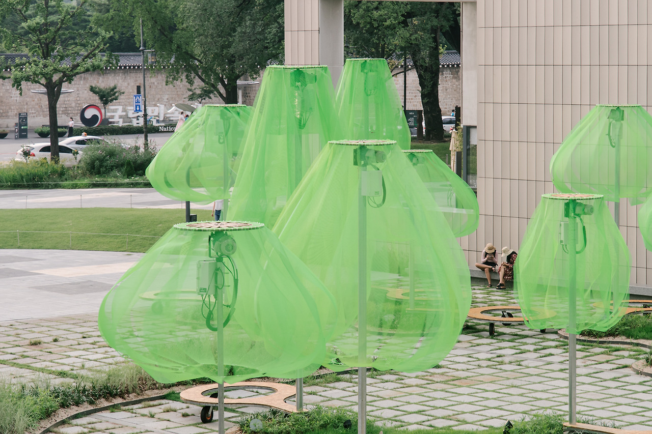 국립현대미술관의 마당으로 들어서자마자 형광빛이 도는 녹색의 나무들이 먼저 시선을 사로잡는다. 동그랗게 곡선을 그리며 떨어지는 연두색의 플라스틱 망은 땅으로부터 올라오는 기둥에 받쳐져 살짝 띄워져 있다. 사람 키보다는 크지만, 건물보다 높지는 않다. 맞다. 이것은 나무. 나무들의 모임, 숲이다.