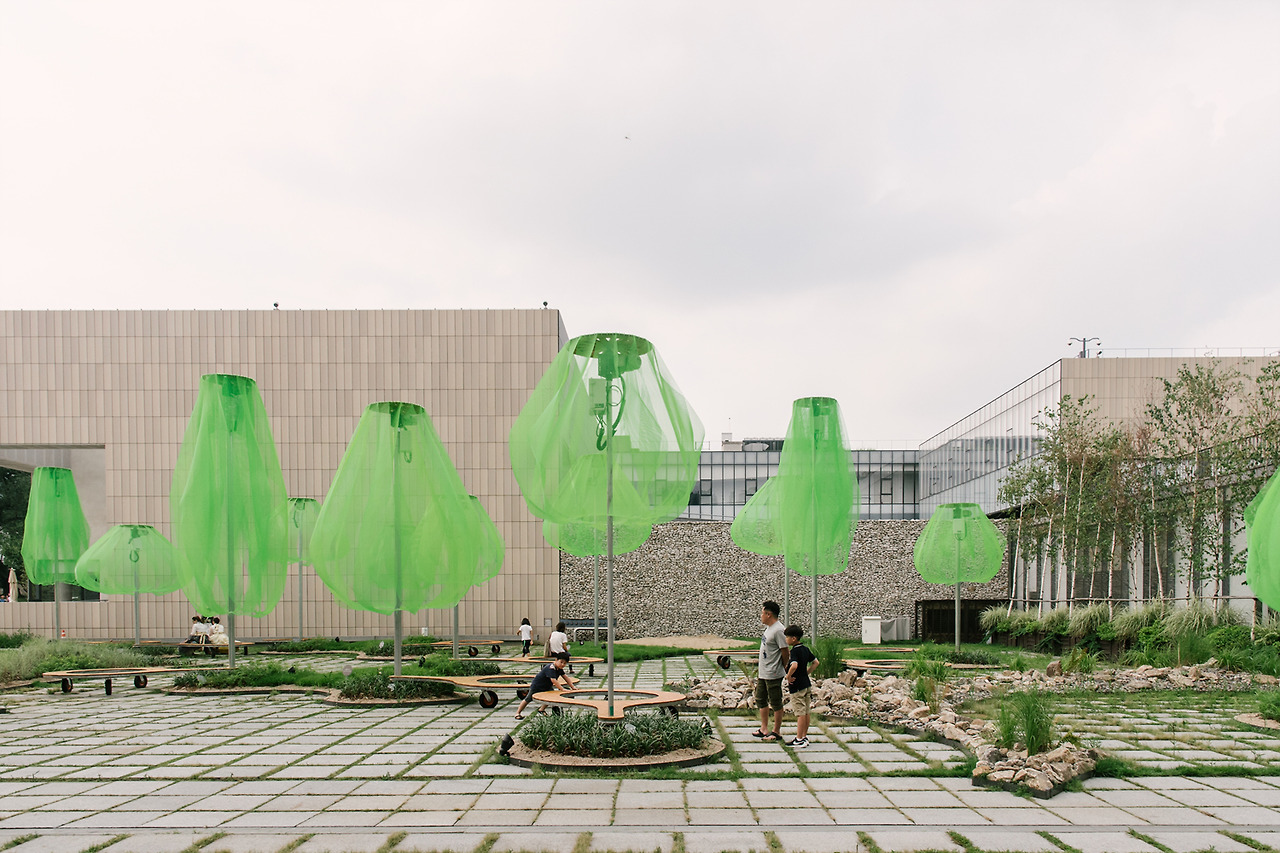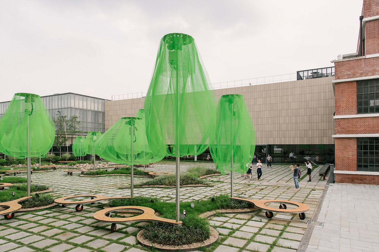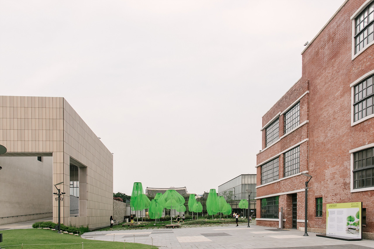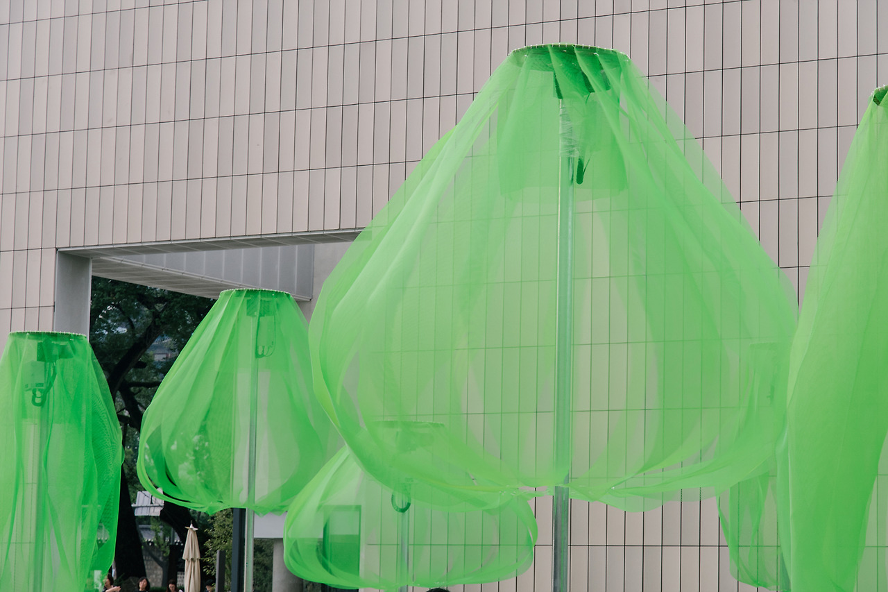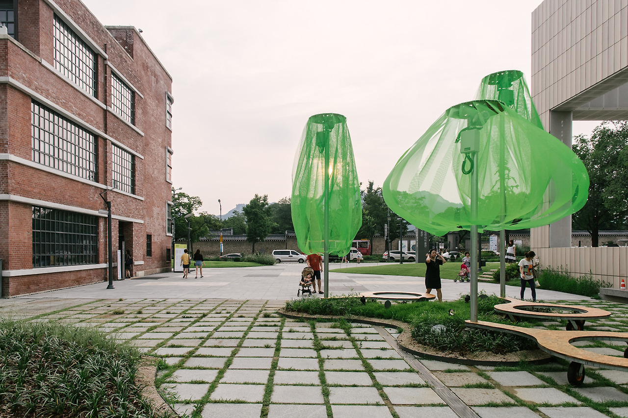 국립현대미술관의 마당으로 들어서자마자 형광빛이 도는 녹색의 나무들이 먼저 시선을 사로잡는다. 동그랗게 곡선을 그리며 떨어지는 연두색의 플라스틱 망은 땅으로부터 올라오는 기둥에 받쳐져 살짝 띄워져 있다. 사람 키보다는 크지만, 건물보다 높지는 않다. 맞다. 이것은 나무. 나무들의 모임, 숲이다.