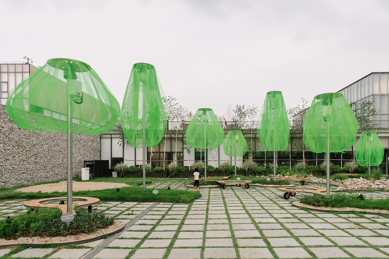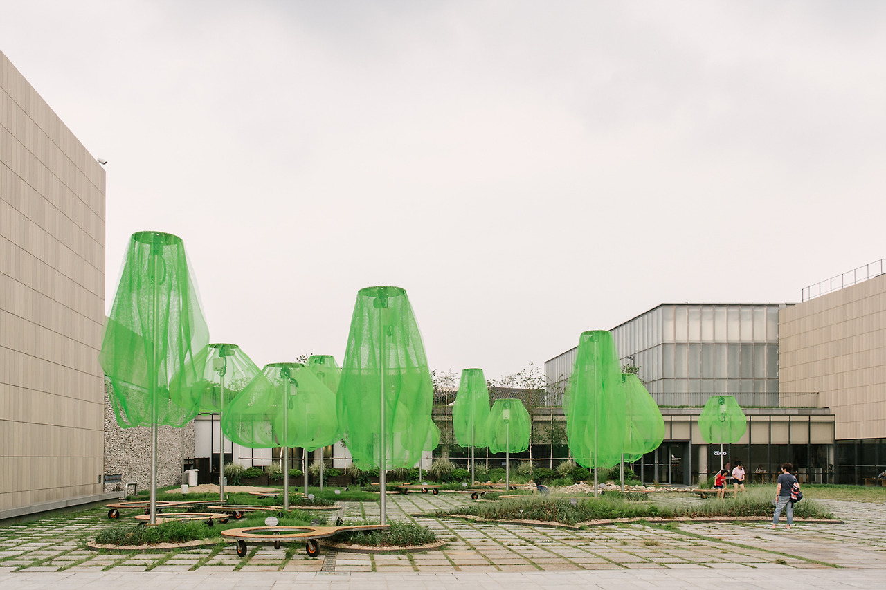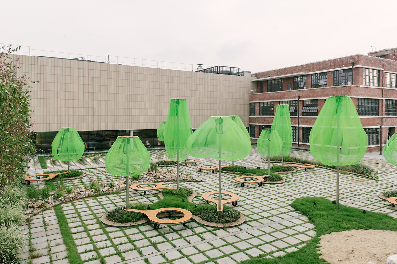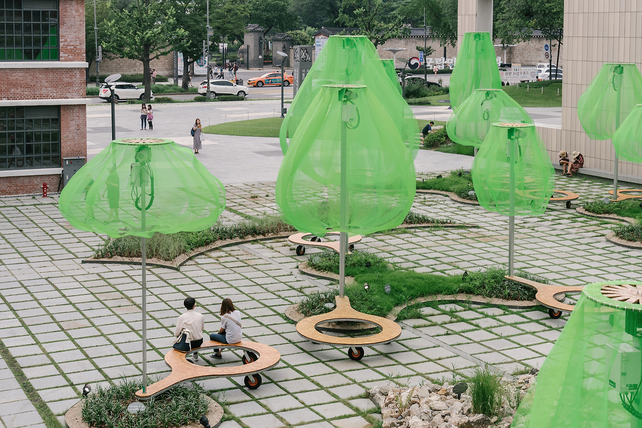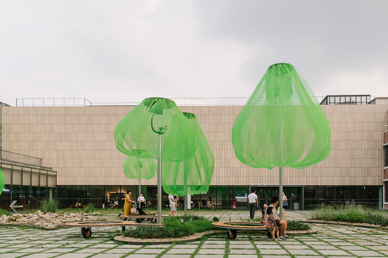 국립현대미술관의 마당으로 들어서자마자 형광빛이 도는 녹색의 나무들이 먼저 시선을 사로잡는다. 동그랗게 곡선을 그리며 떨어지는 연두색의 플라스틱 망은 땅으로부터 올라오는 기둥에 받쳐져 살짝 띄워져 있다. 사람 키보다는 크지만, 건물보다 높지는 않다. 맞다. 이것은 나무. 나무들의 모임, 숲이다.