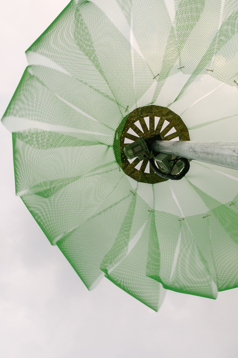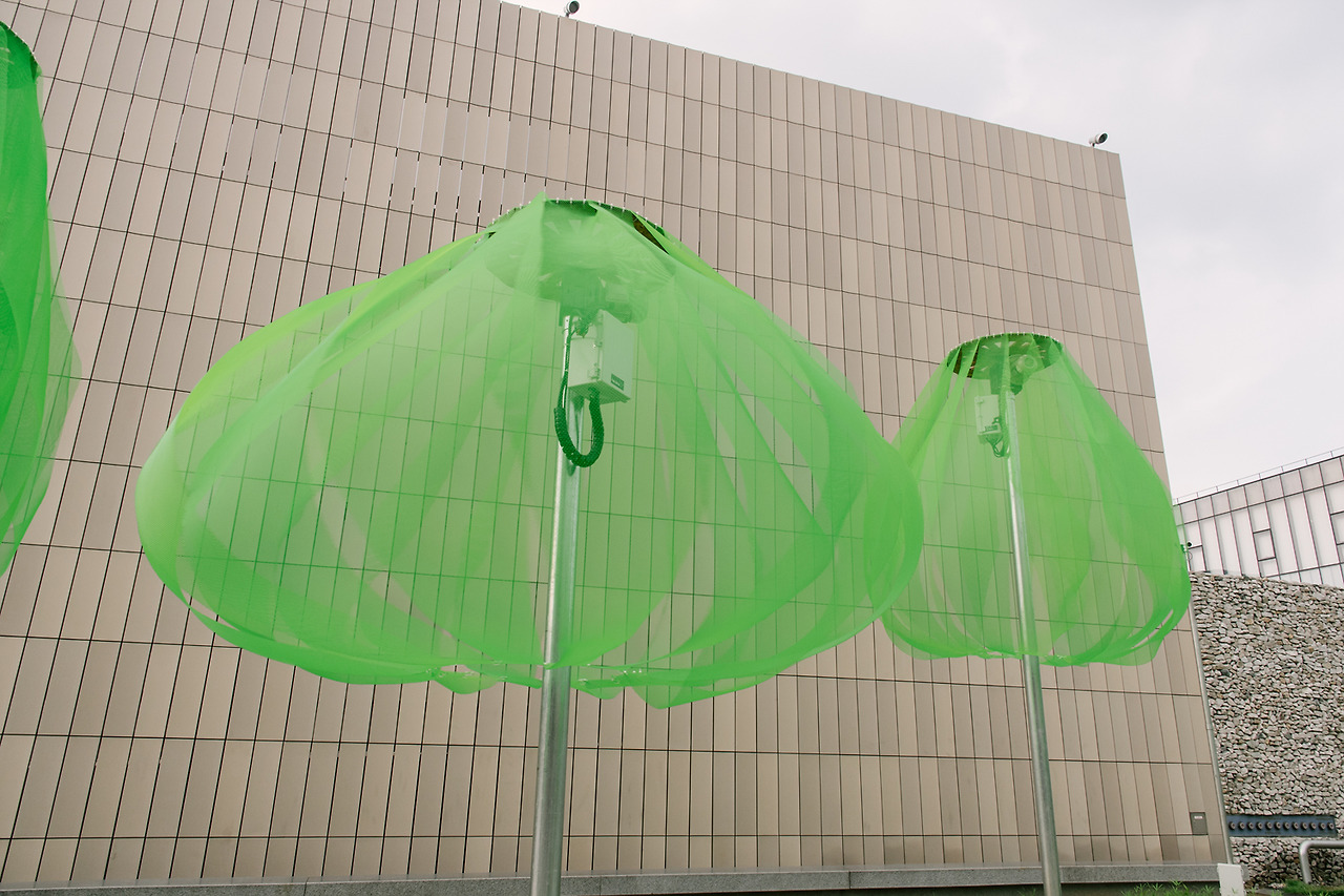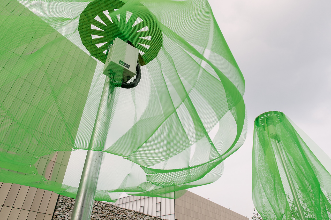 반면 바람이 불면 모터는 정지한다. 플라스틱 망 자체에는 큰 힘이 없기 때문에 중력에 따라 땅으로 흘러내린다. 기둥을 감싸고 있는 꽤 날씬한 모양새가 되니 바람이 불어도 큰 저항을 받지 않는다. 바람은 그 사이를 통과해 지나간다. 그 자체로 이미 구멍이 숭숭 뚫린 망인 덕분에 더 쉽다.